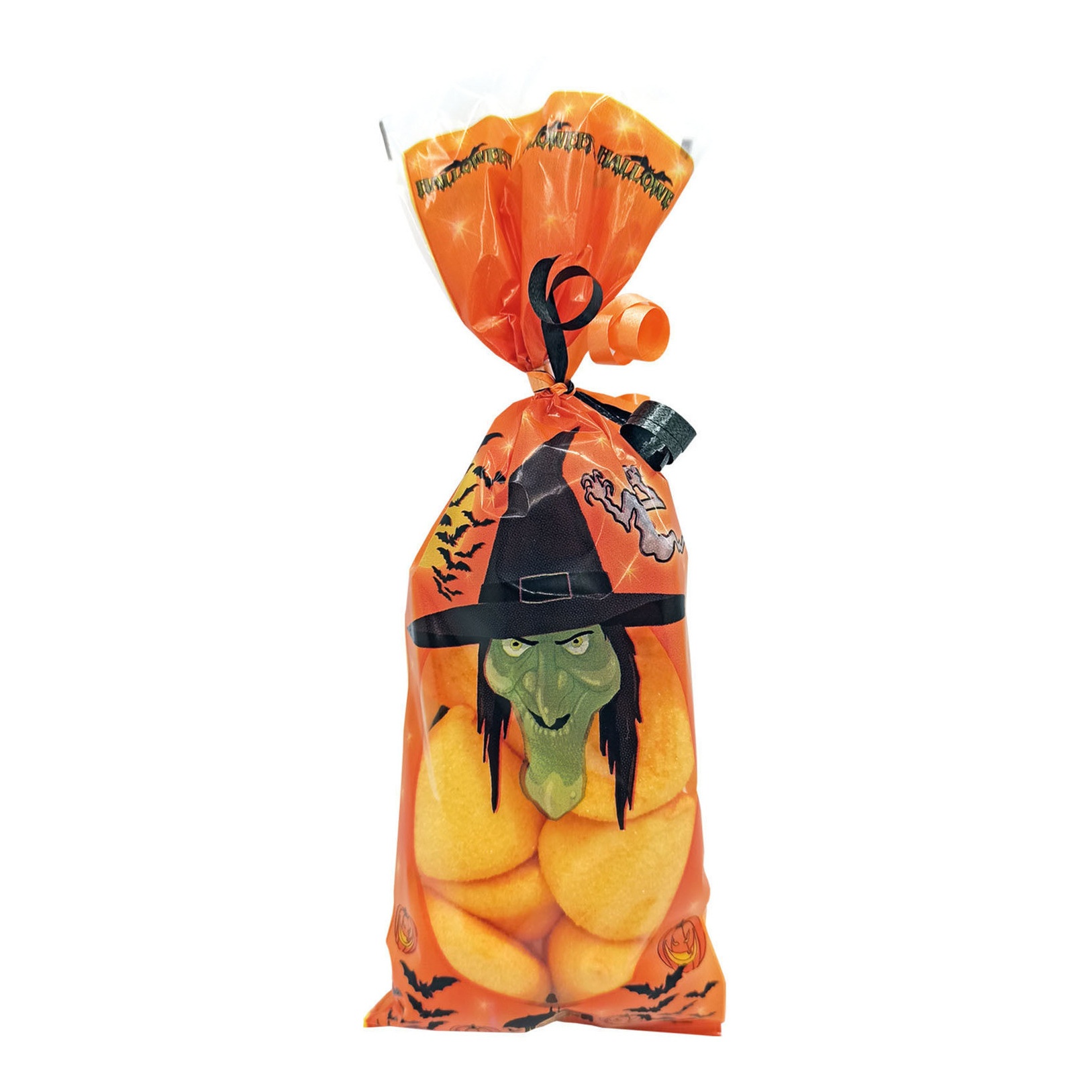 Des sacs contenant des guimauves en forme de citrouille dans un sac plastique décoré d'une sorcière verte.