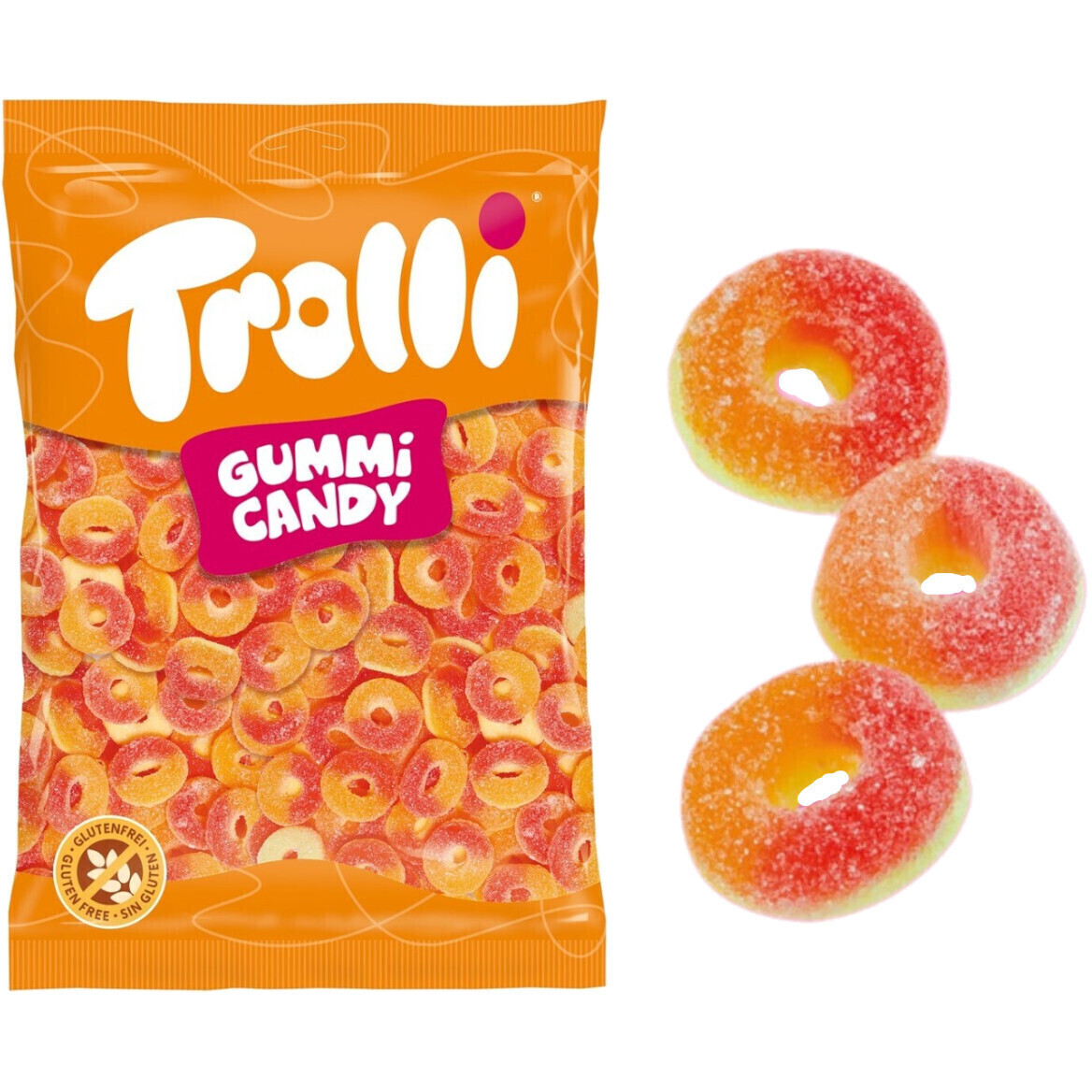 Ingrédients: Sirop de glucose, sucre, 4,8 % de jus de pêche à partir de concentré de pêche, gélatine, acidifiants: acide citrique, acide lactique, humectant: sorbitol, arôme, colorants: carmin, curcumine.