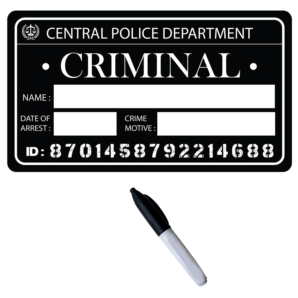 Ardoise de criminel en PVC au design type fiche de police pour apporter un rendu réaliste à vos photos et photocalls. Sa surface s'écrit et s'efface très facilement, vous permettant de personnaliser noms, dates et motifs. Légère et résistante, elle convient parfaitement aux fêtes à thème, aux séances photo et comme accessoire de déguisement. Produit réutilisable et d'utilisation simple.