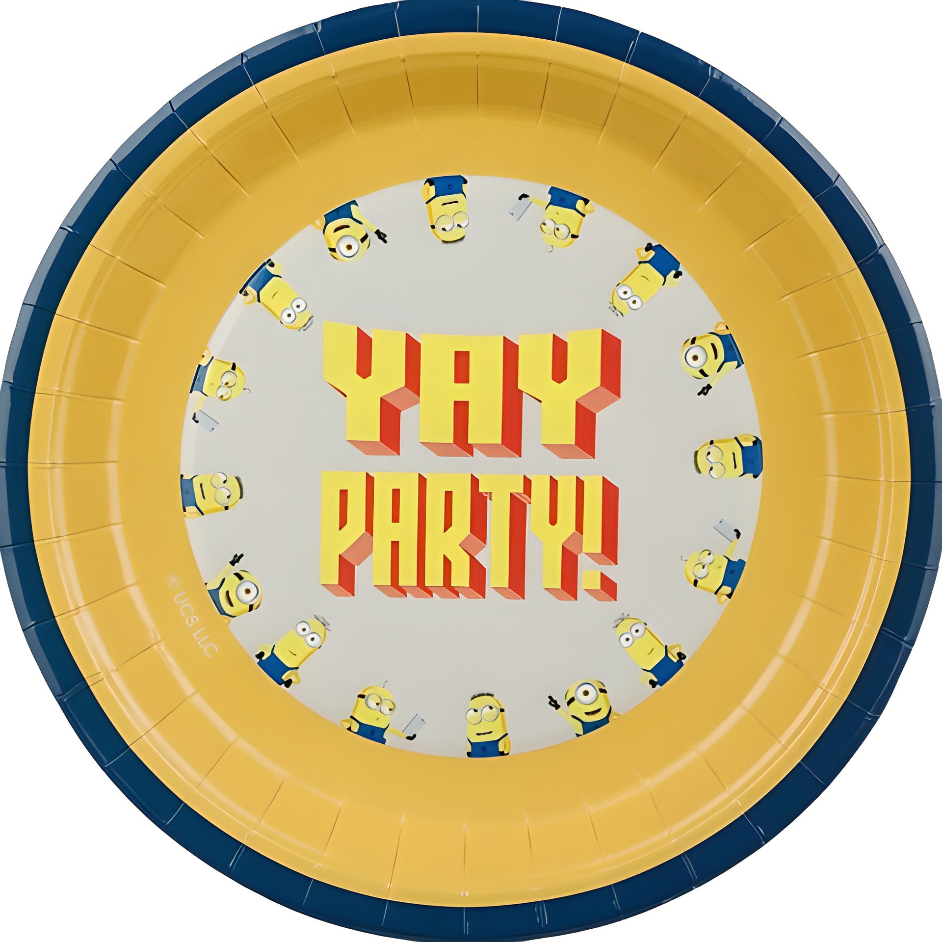 Assiettes jetables au motif amusant des Minions, avec la mention Yay Party!.