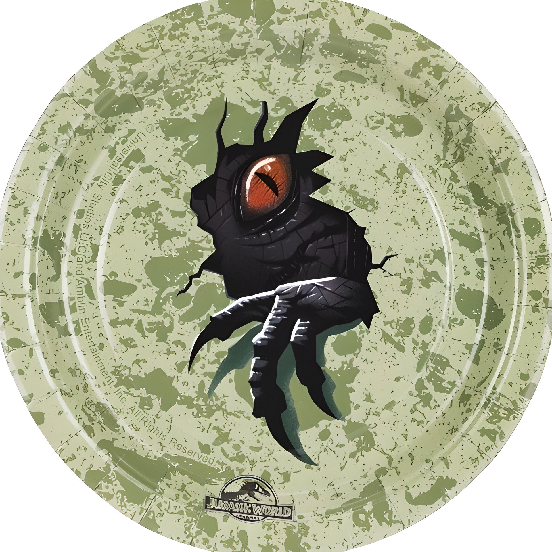 Assiettes en papier Jurassic World rondes au design inspiré de la saga, parfaites pour que vous puissiez décorer les tables d'enfants avec des motifs de dinosaures. Diamètre approximatif 18 cm ; assortiment de couleurs et finition voyante qui ressort dans la décoration.