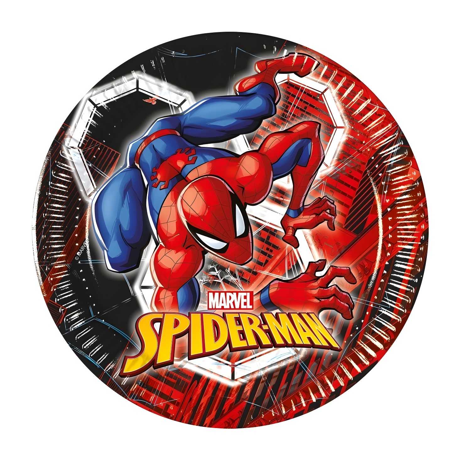 Assiettes jetables au design accrocheur Spider-Man et motifs de toile d'araignée, parfaites pour égayer vos célébrations infantiles. Lot de 8 assiettes de 20 cm de diamètre, conçu pour des portions adaptées aux enfants. Fabriquées en carton certifié FSC, elles sont idéales pour servir collations et repas lors de la fête.