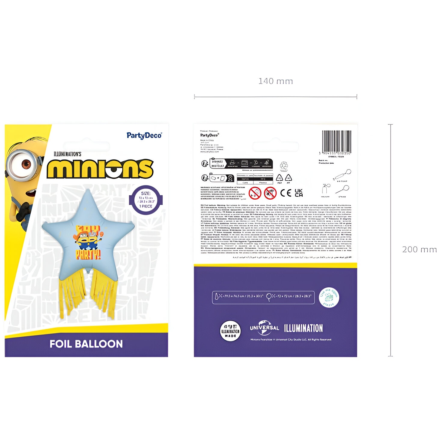 Ballon en forme d'étoile au design amusant Minions, qui apportera une touche joyeuse à vos fêtes pour enfants. Les franges ajoutées offrent du mouvement et une finition festive qui se démarque dans toute décoration. Vous pouvez le gonfler à l'air ou à l'hélium selon vos besoins. Une paille est incluse pour faciliter le gonflage manuel ; dimensions approximatives une fois gonflé: 72 x 72 cm.