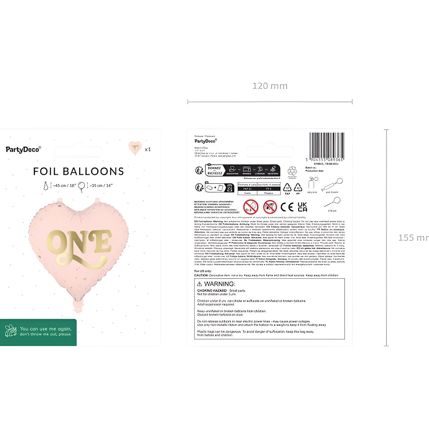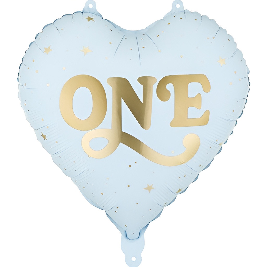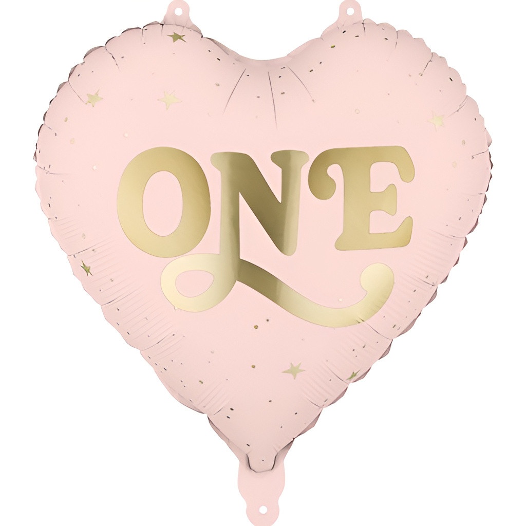 Ballon en film métallisé, en forme de coeur, de couleur rose pâle avec inscription dorée « ONE », conçu pour apporter une touche élégante à votre décoration de premier anniversaire.