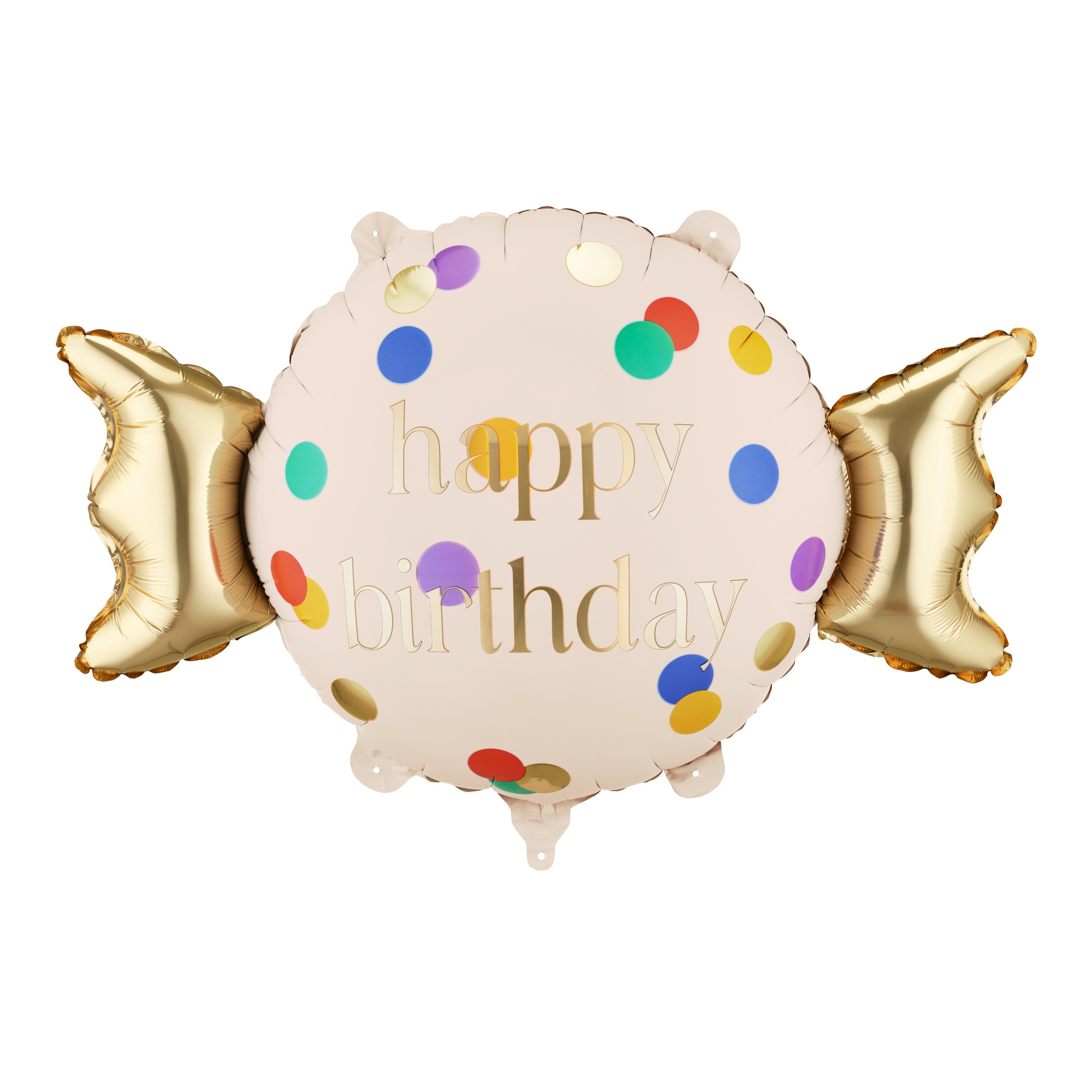 Ballon Candy "Happy Birthday" dans des tons beiges avec détails dorés, décoré de confettis multicolores et portant l'inscription "happy birthday" en finition brillante.