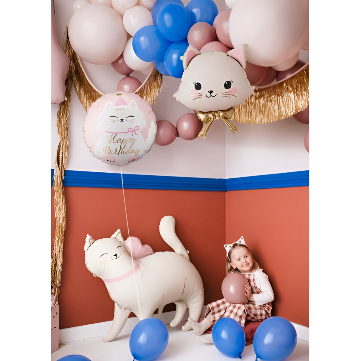 Ballon en foil de forme ronde avec un motif de chaton et l'inscription « Happy Birthday » en détails dorés. Couleurs mixtes aux tonalités douces, pensées pour les célébrations d'enfants.