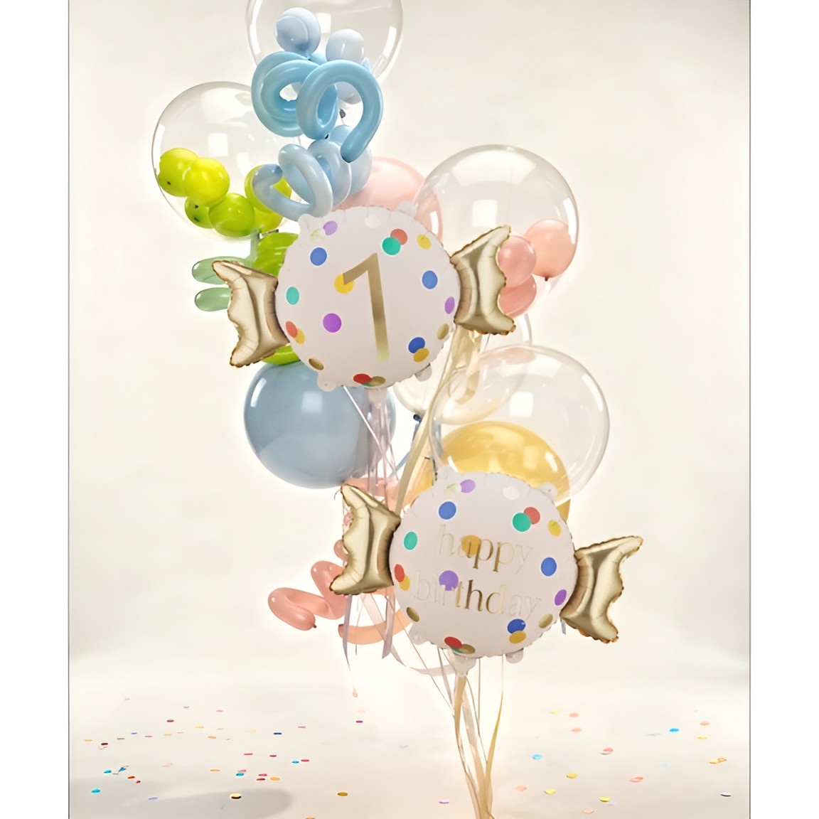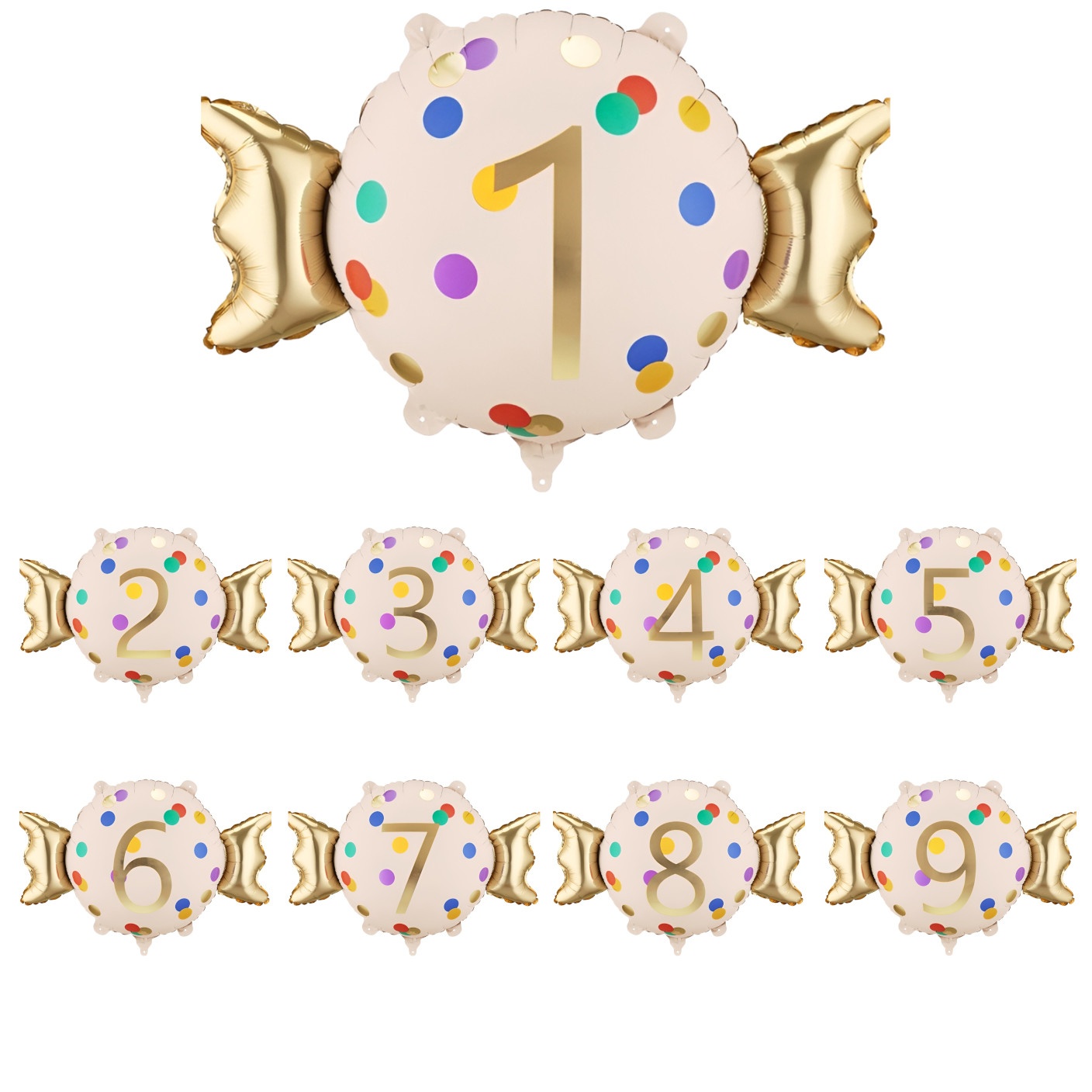 Ballon décoratif arborant le chiffre 1 dans une combinaison beige et dorée élégante. Son design « bonbon » à pois multicolores apporte une touche festive et sophistiquée. Dimensions approximatives avant gonflage: 76,5 x 48 cm ; après gonflage: 61 x 37 cm. Gonflable à l'air ou à l'hélium, il est pensé pour devenir le point focal de votre célébration. Idéal pour un premier anniversaire, des séances photo et pour décorer tables de desserts ou coins spéciaux.