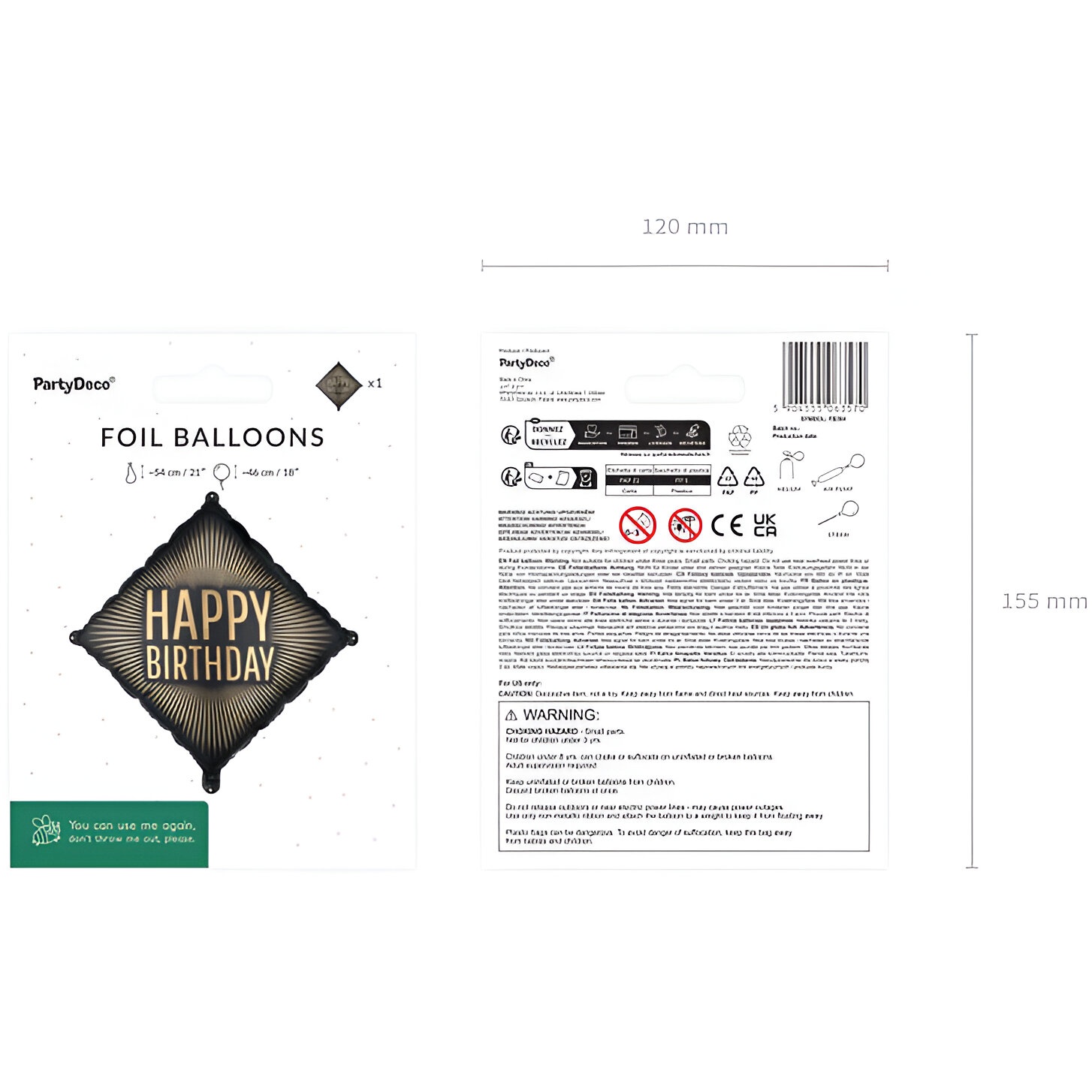 - Design élégant en noir et doré avec l'inscription visible « Happy Birthday ».