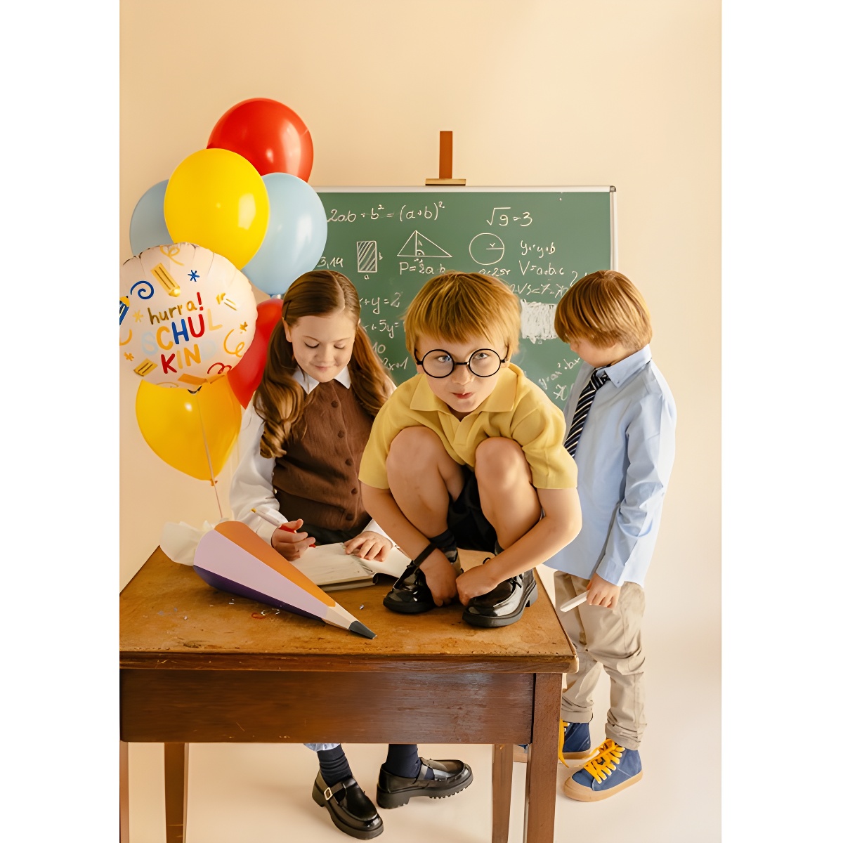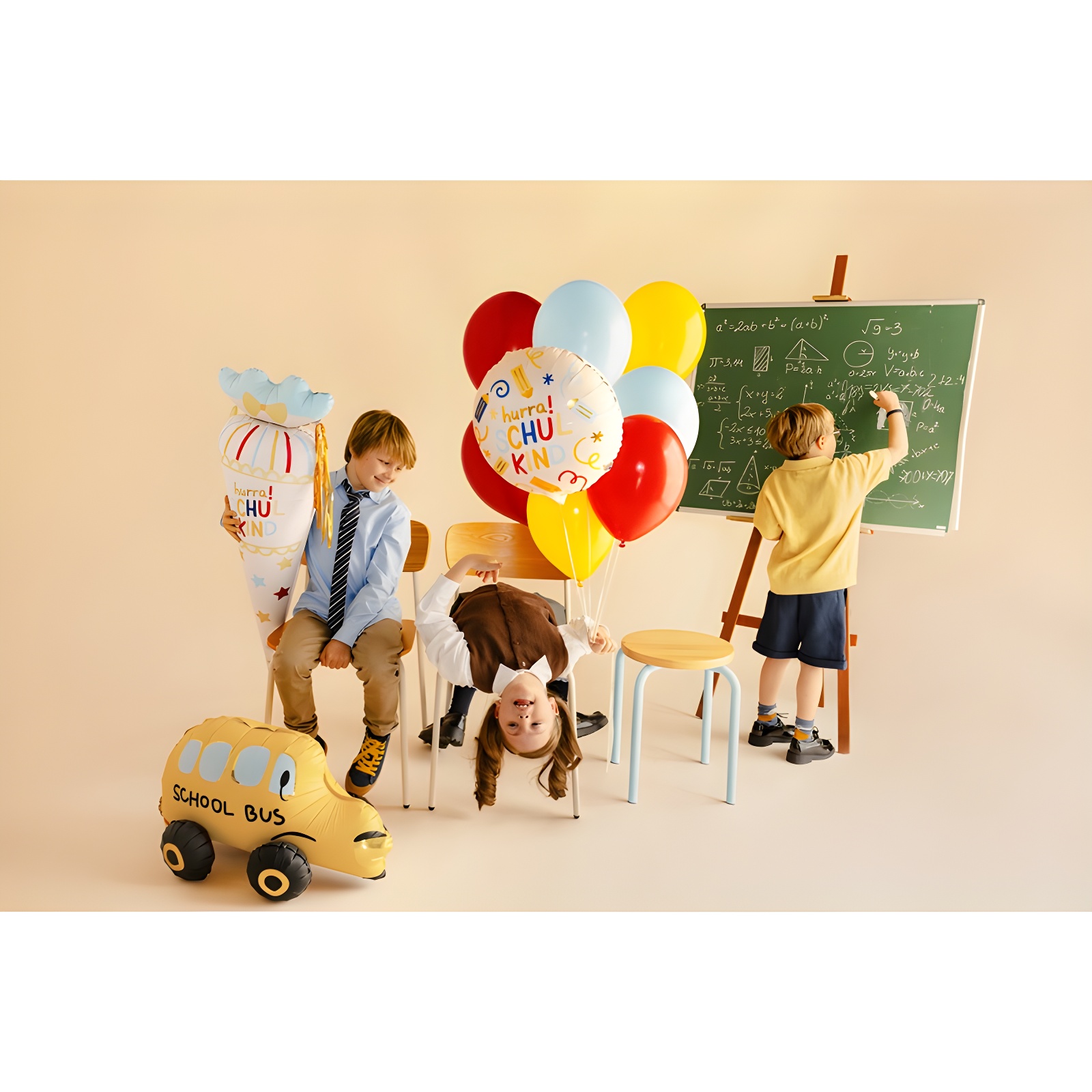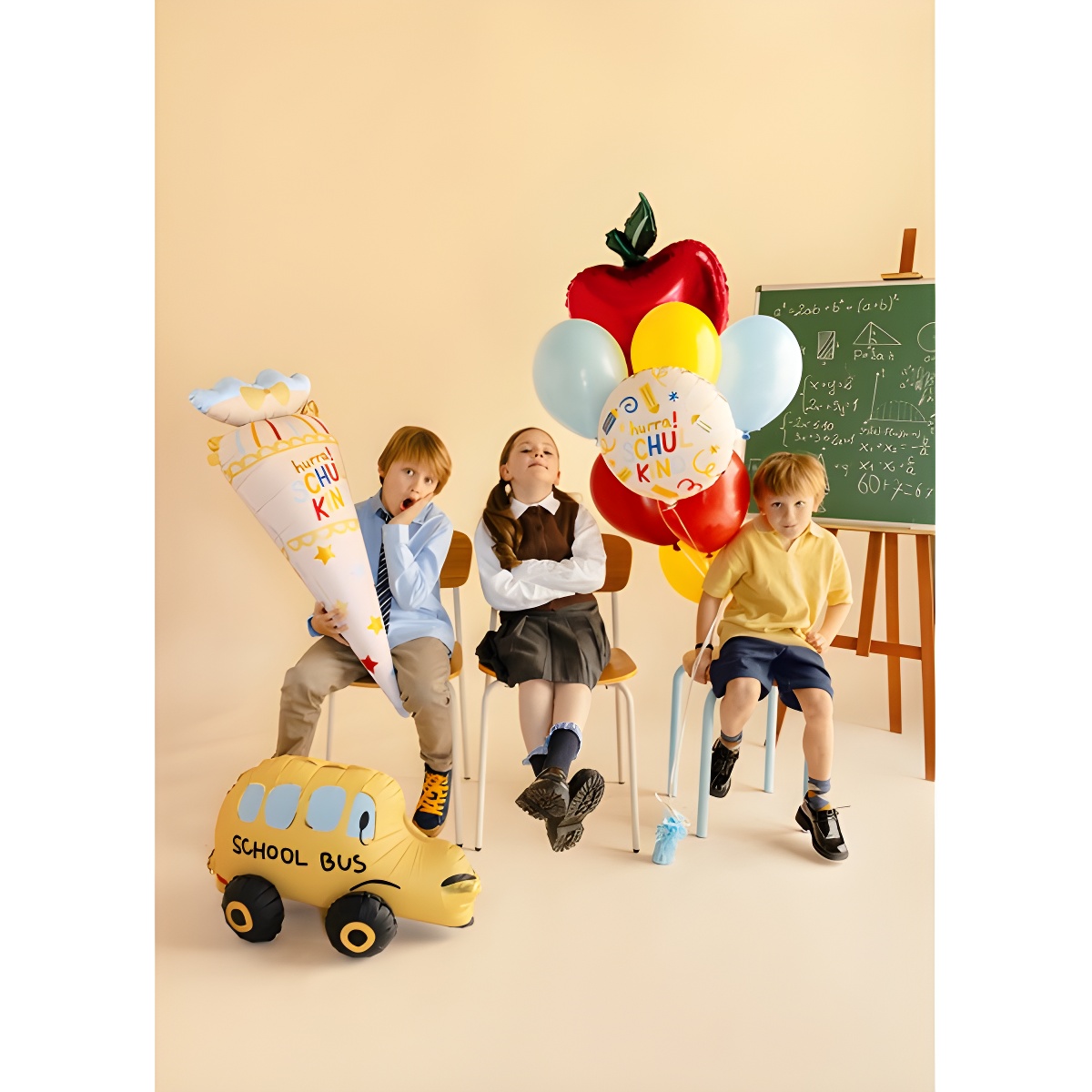 Ballon décoratif portant le texte Hurra Schulkind et des motifs scolaires sur fond crème et couleurs vives. Son design joyeux apporte une touche festive idéale pour les célébrations liées à l'école.