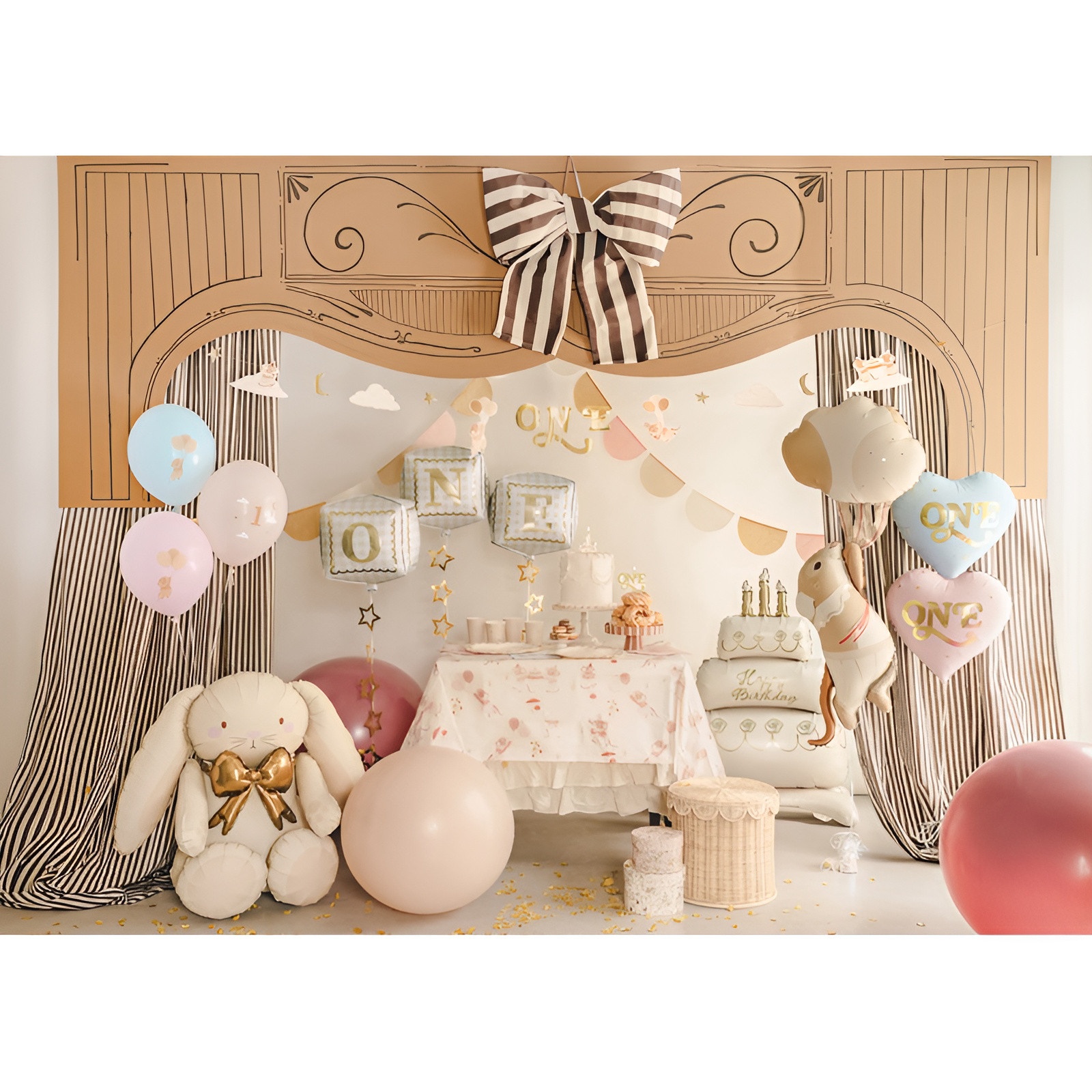 Ballons idéaux pour célébrer le premier anniversaire avec un motif tendre de souris et le chiffre 1 en tons pastel, apportant une touche délicate à la décoration.