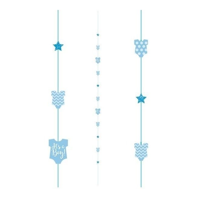 Découvrez notre décoration prête à attacher à vos ballons pour votre fête de baby shower. Elle se compose d'un fil de pêche décoré avec plusieurs figures en papier en forme de vêtements de bébé et d'étoiles.