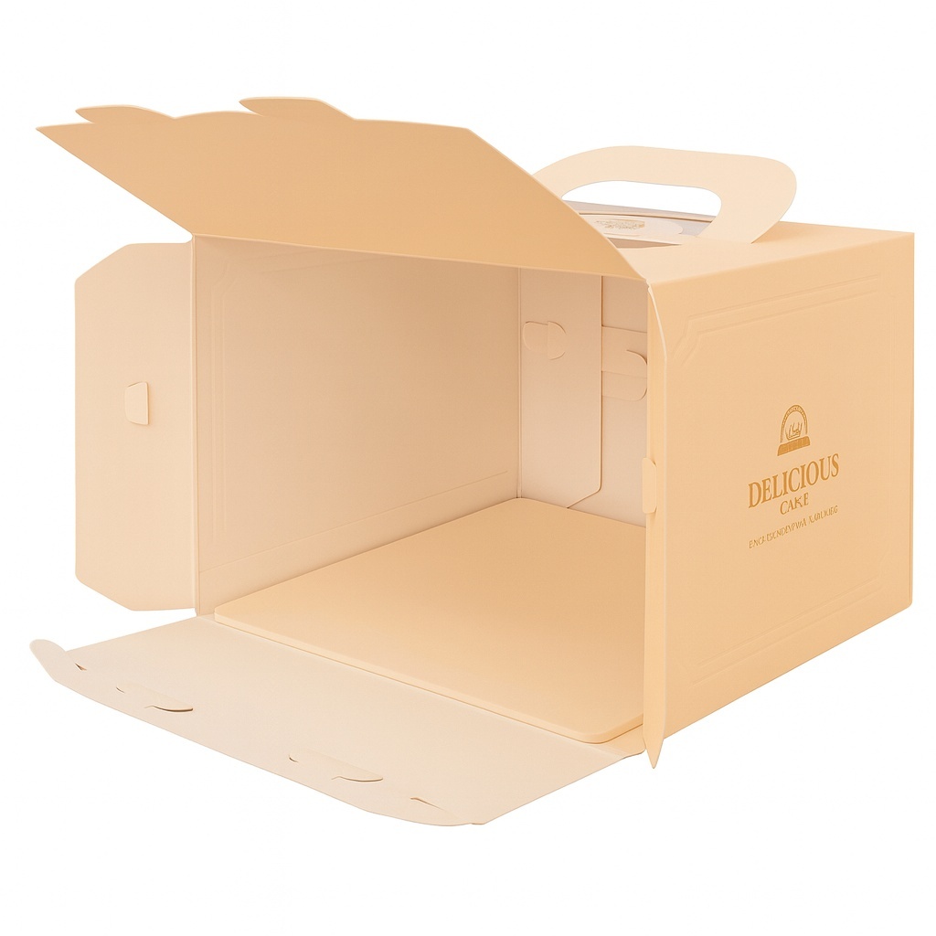Élégante boîte en carton rigide, parfaite pour transporter et présenter gâteaux, pâtisseries et autres créations de boulangerie.