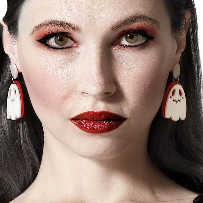 • Paire de boucles d'oreilles en forme de fantôme en rouge et blanc. Amusantes et thématiques.