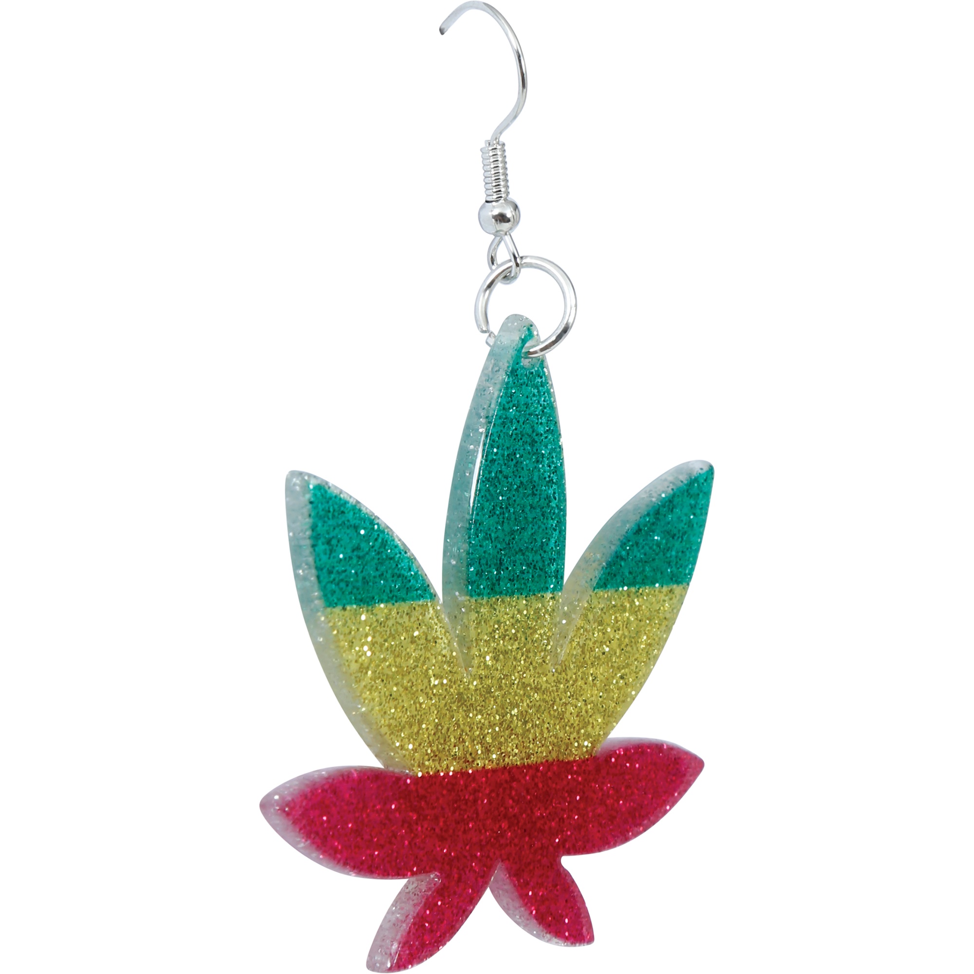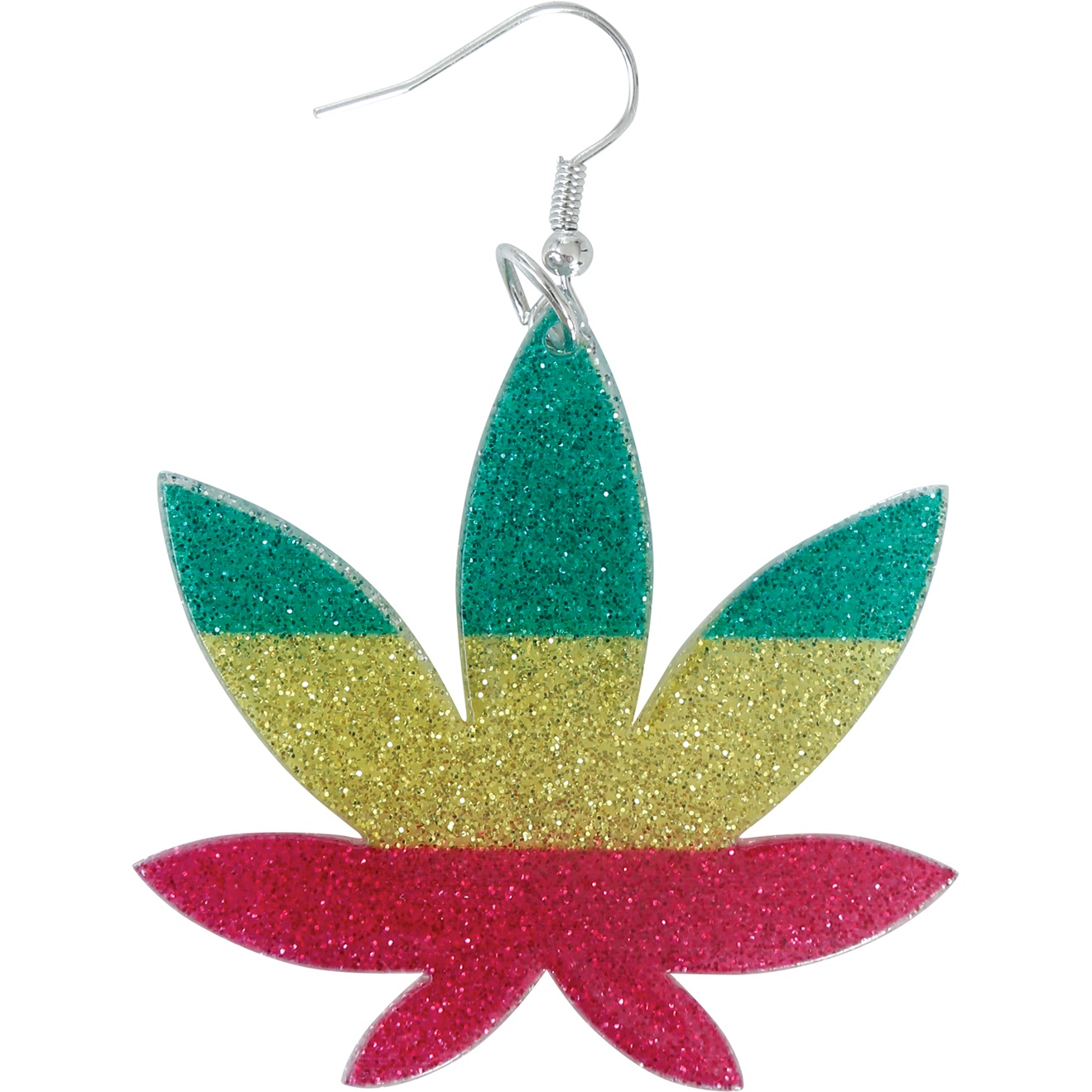 Boucles d'oreilles en forme de feuille de cannabis aux couleurs classiques jamaïcaines: vert, jaune et rouge. Leur finition pailletée apporte une touche audacieuse et décontractée. Fabriquées en métal et PVC, elles allient solidité et légèreté. Les crochets métalliques se mettent facilement et assurent un bon confort. Accessoire parfait pour ajouter une note reggae ou alternative à votre look.