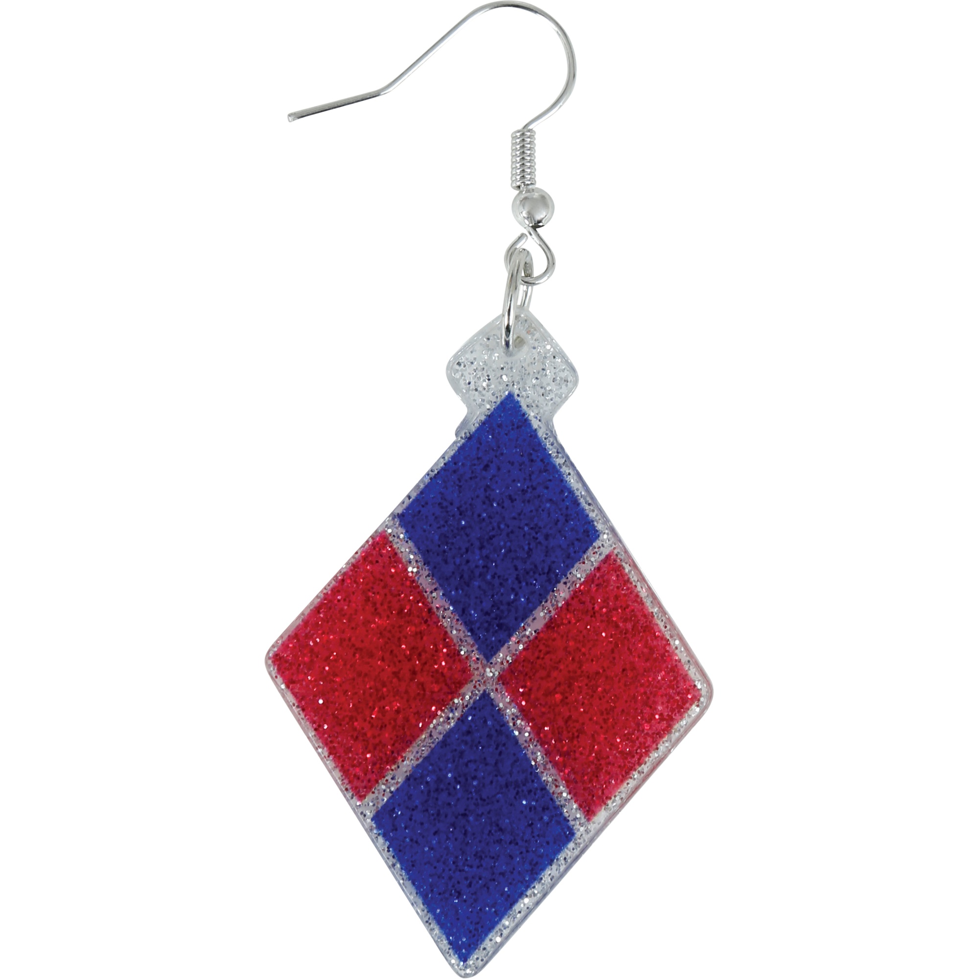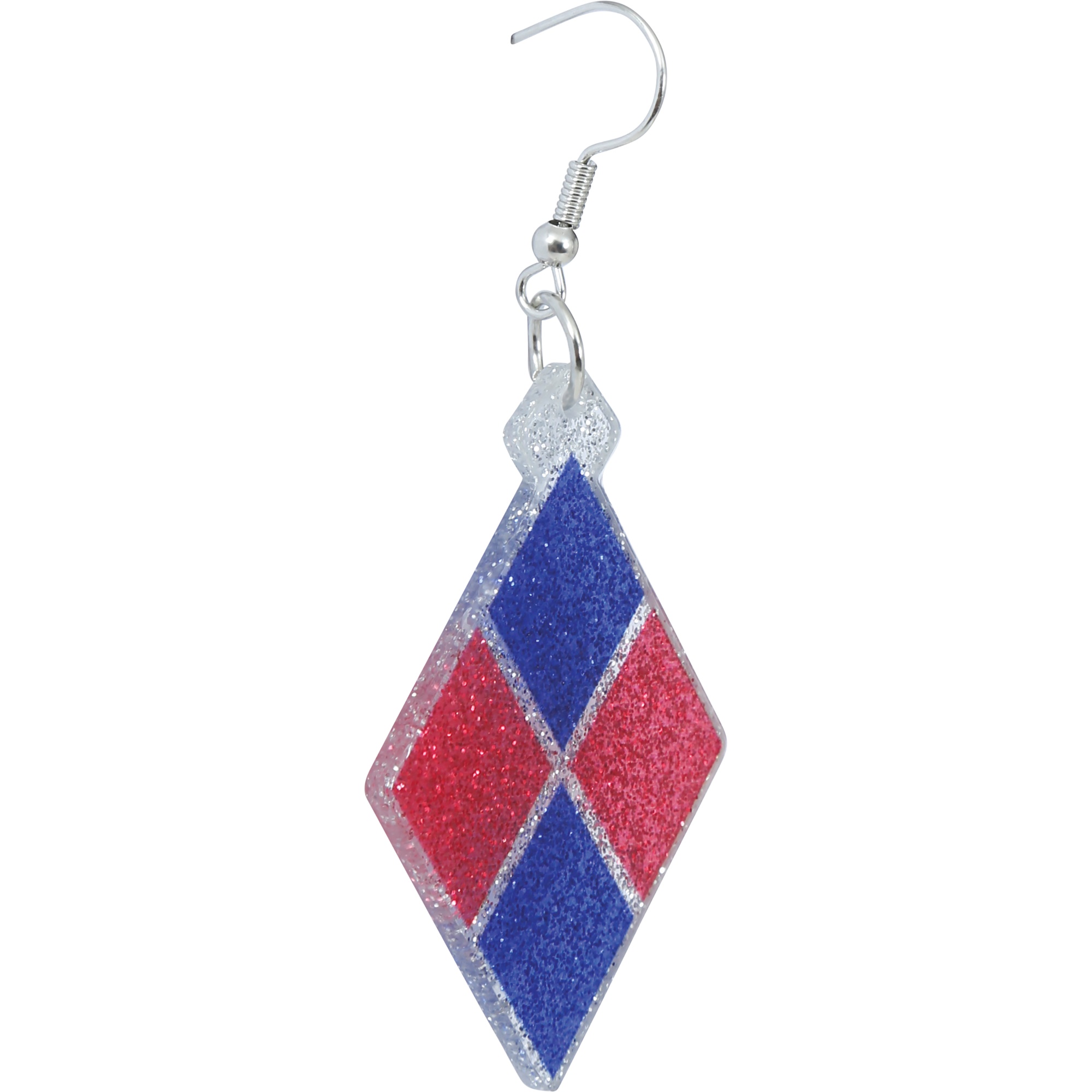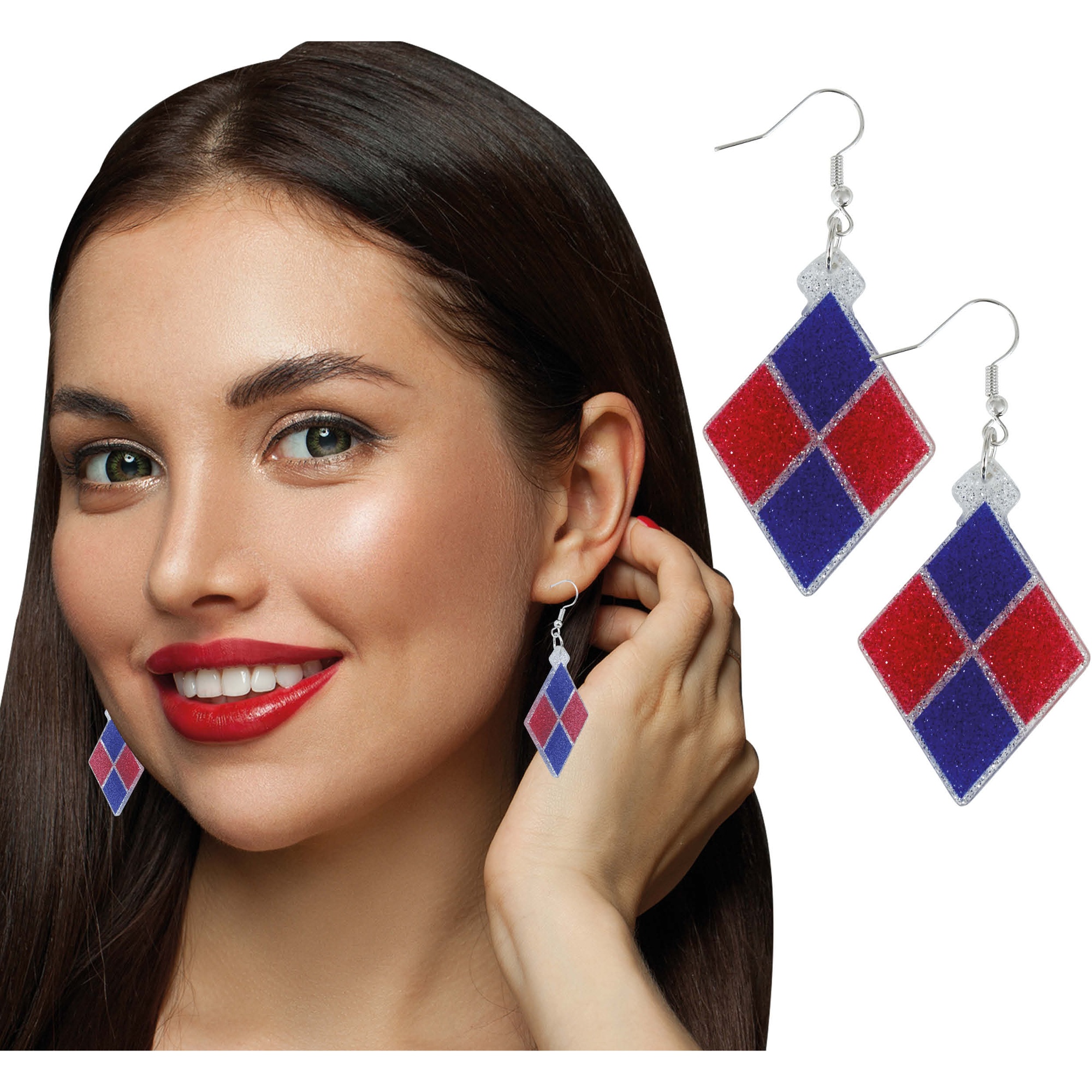 Boucles d'oreilles pendantes au motif losange dans les couleurs classiques rouge et bleu, inspirées du style Harley Quinn.