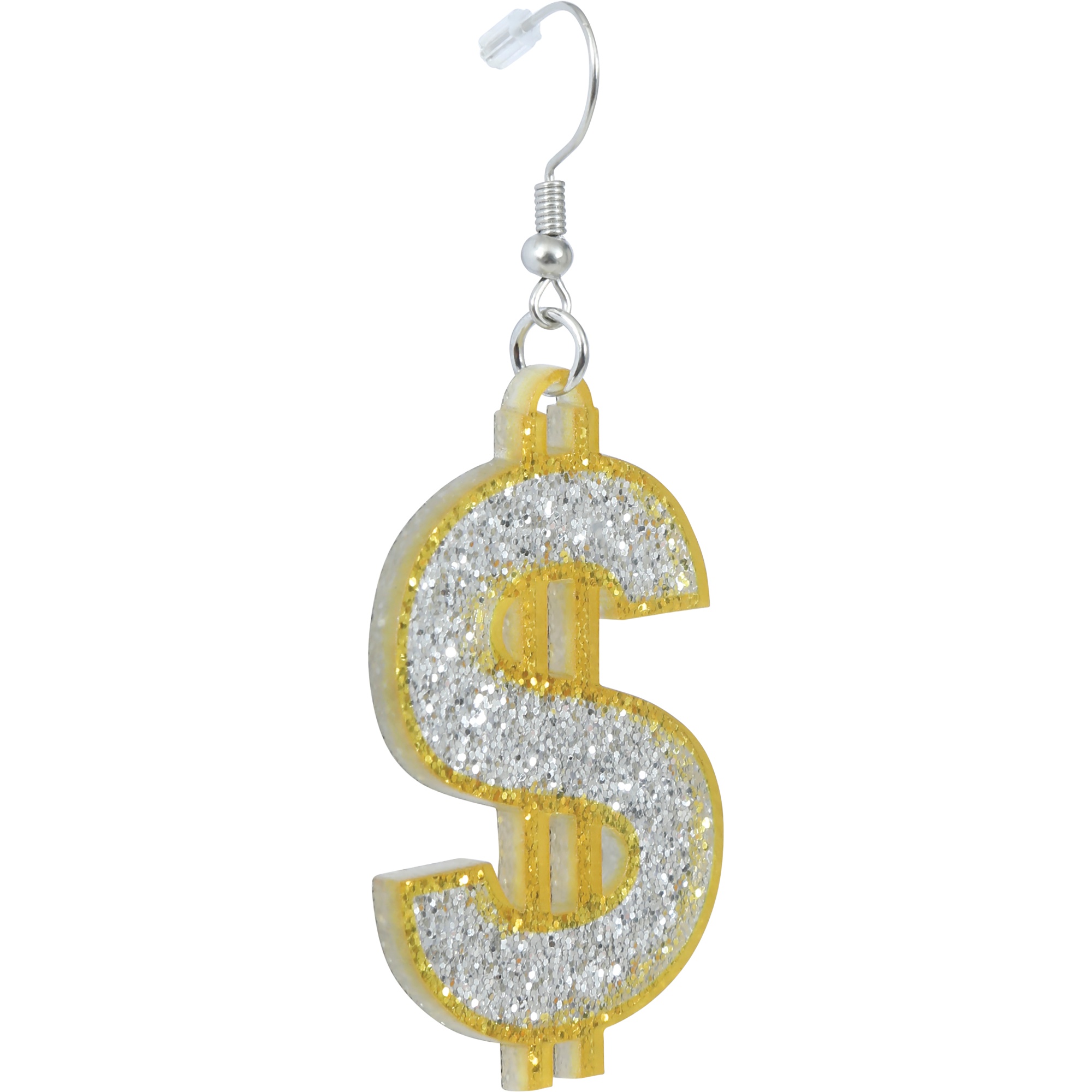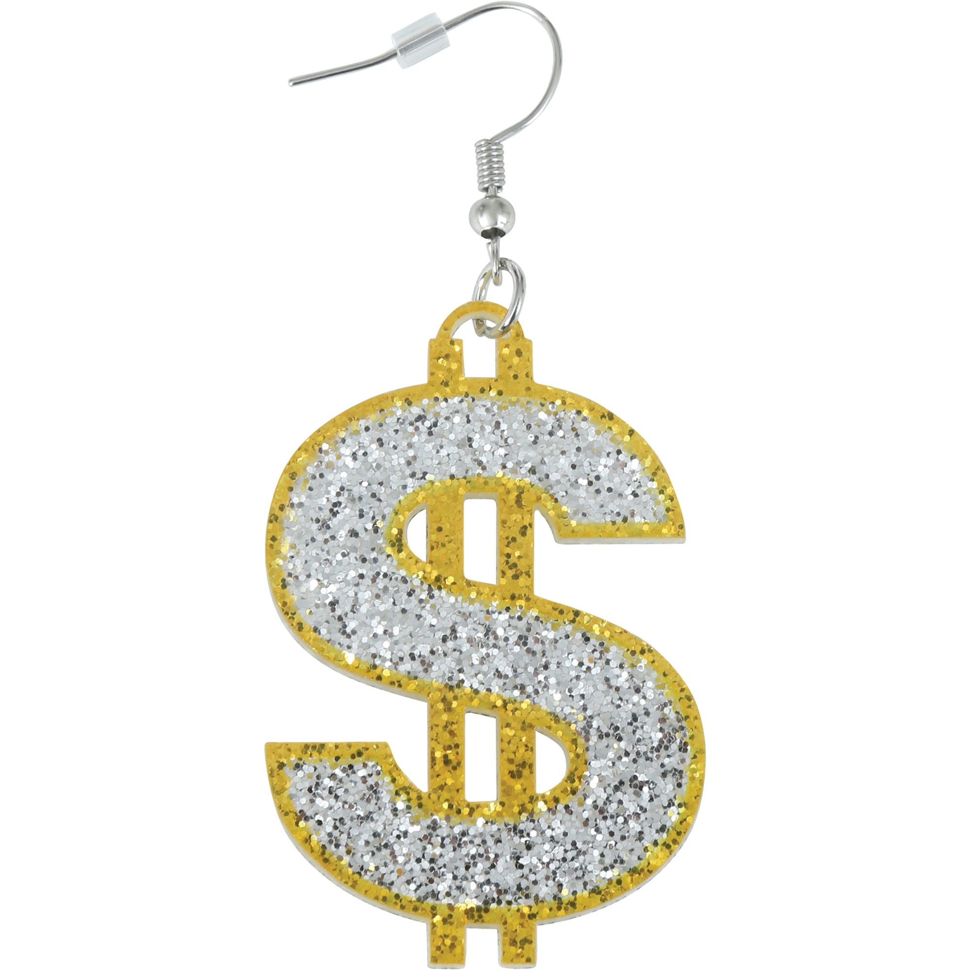 • Design iconique en forme de signe dollar avec paillettes argentées et bord doré.