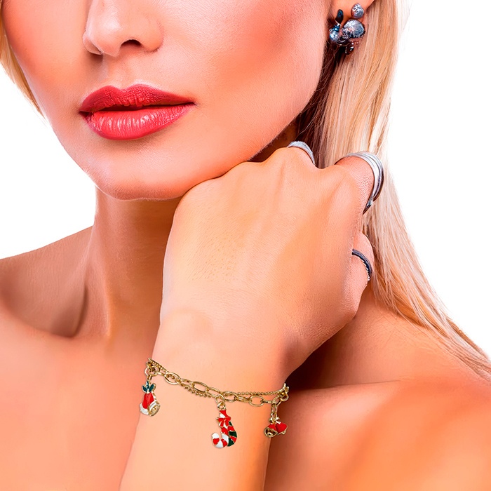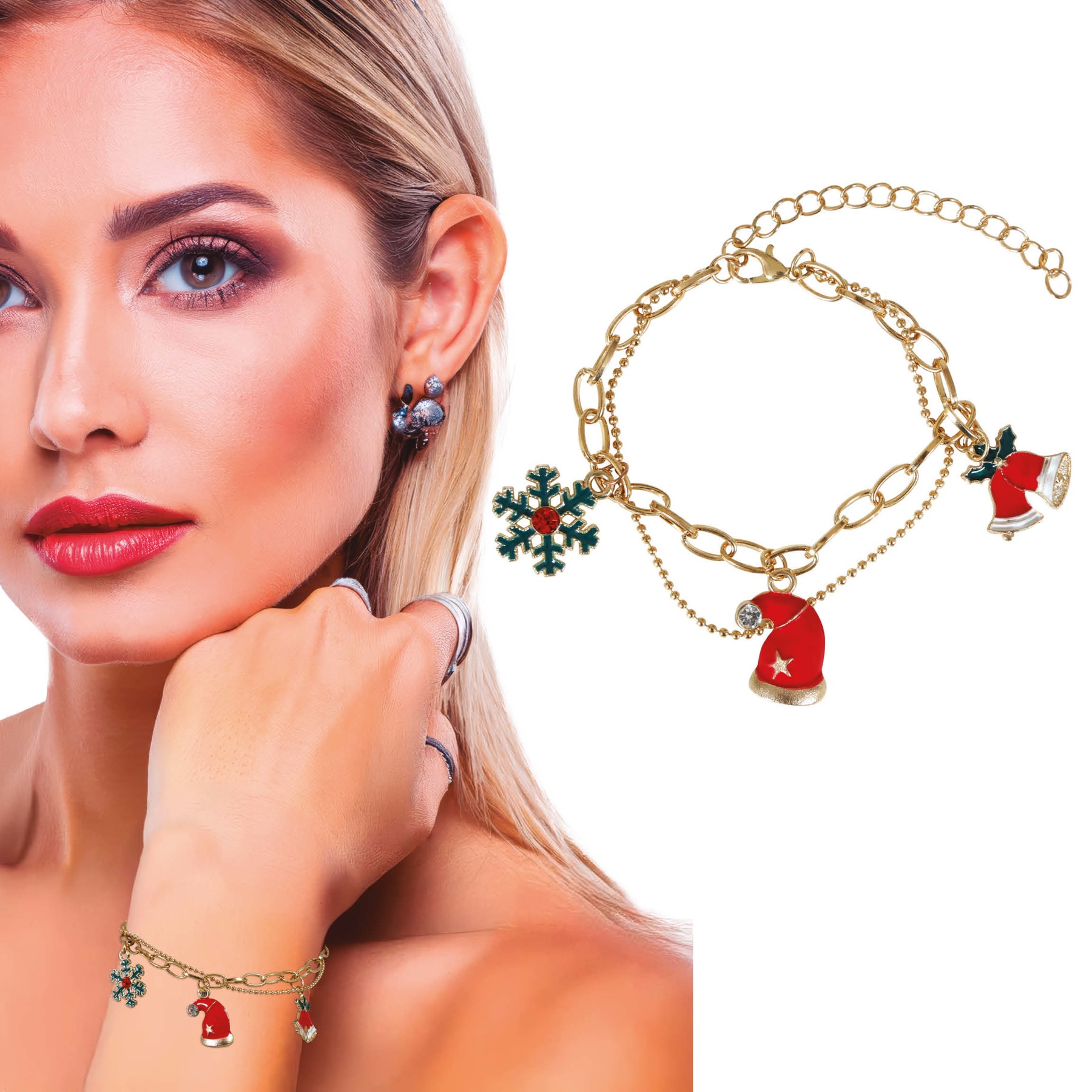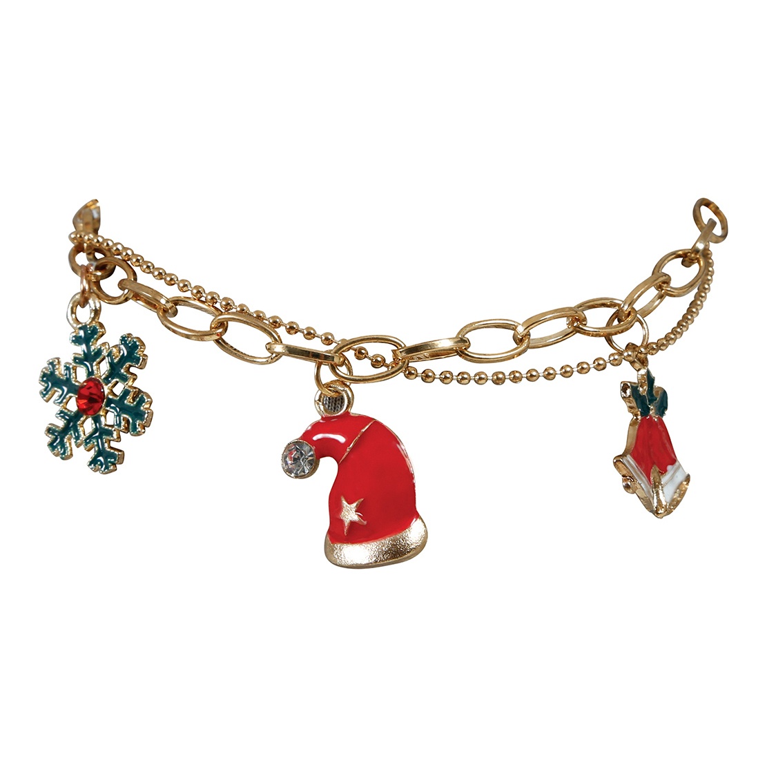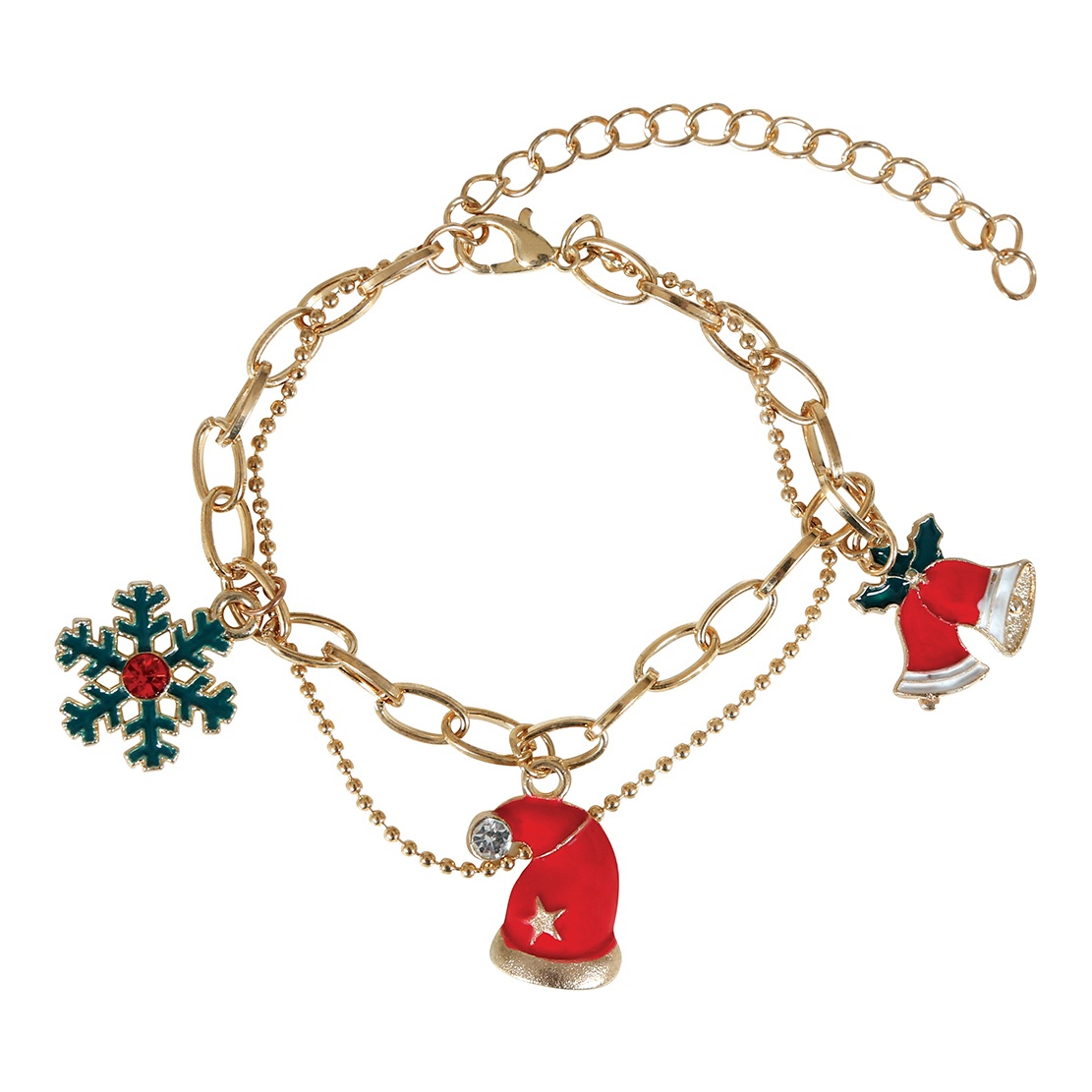 • Chaîne dorée avec un flocon de neige, des clochettes et un bonnet