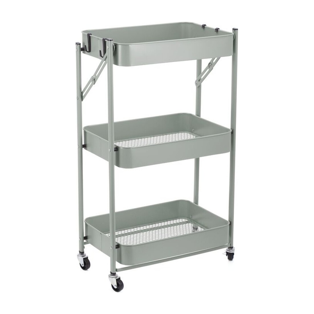 Chariot d'appoint à trois niveaux au design pliable qui vous permet d'optimiser l'espace dans n'importe quelle pièce. Polyvalent et pratique, il vous permet d'organiser la cuisine, la salle de bains, le bureau ou votre coin bricolage. Les plateaux profonds et les roues pivotantes facilitent son déplacement sans effort. La finition vert moderne s'accorde avec différents styles de décoration.