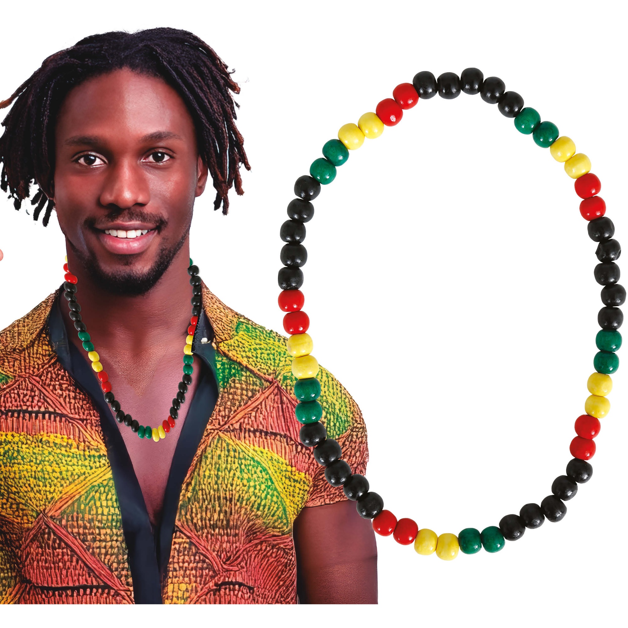 Collier rasta au design jamaïcain qui apporte couleur et personnalité à tous vos looks. Les perles rouges, jaunes, vertes et noires reproduisent l'esthétique rasta de façon vive et authentique. Léger et confortable, il est parfait pour vos fêtes, le Carnaval, les concerts reggae ou pour compléter une tenue décontractée. Accessoire unisexe, il se distingue par sa grande facilité d'association et son style tropical.