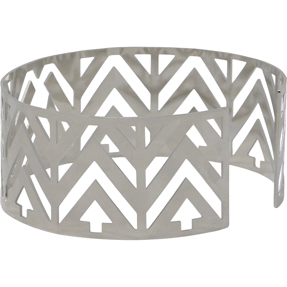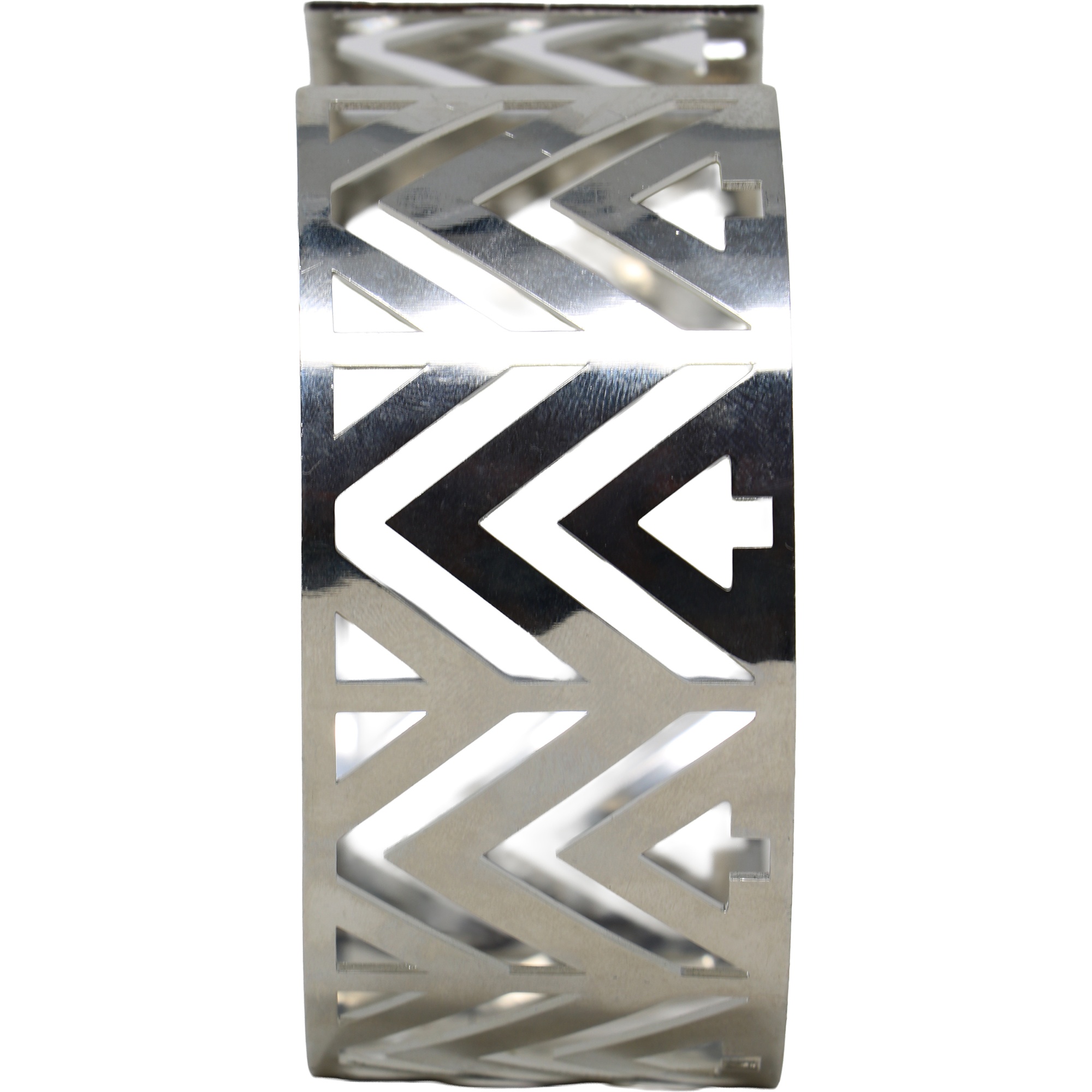 - Design rigide et géométrique avec finition métallique réfléchissante pour un look futuriste.