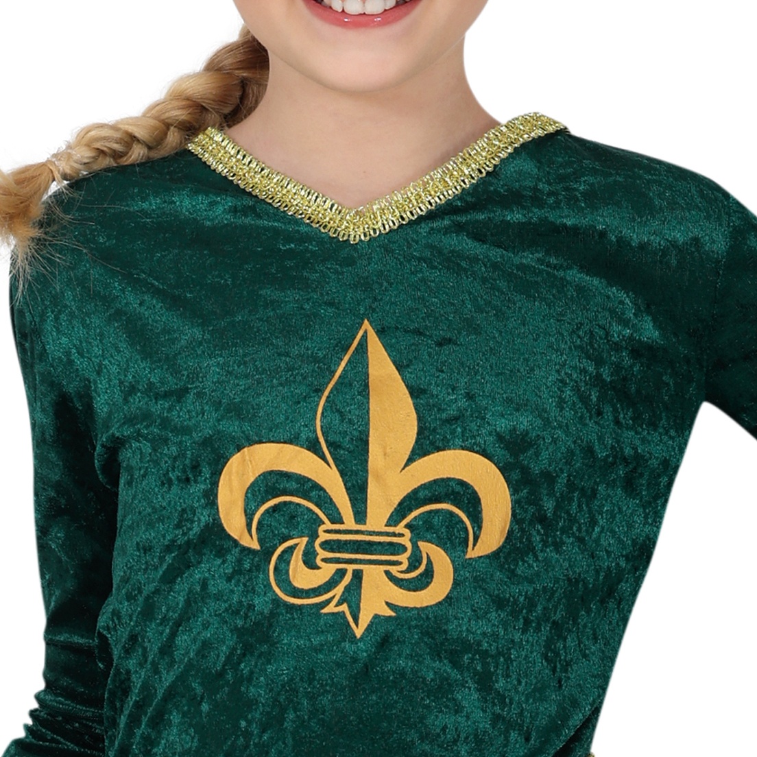 Elle comporte des détails dorés comme l'insigne de la fleur de lys gravée sur la poitrine et les bordures dorées qui entourent la tenue, lui donnant une touche élégante. Pour que la taille soit plus ajustée et pour obtenir une belle silhouette, elle est dotée de deux rubans sur les côtés à nouer à l'arrière. Vous pouvez compléter l'ensemble avec cette belle couronne dorée terminée en pointes.