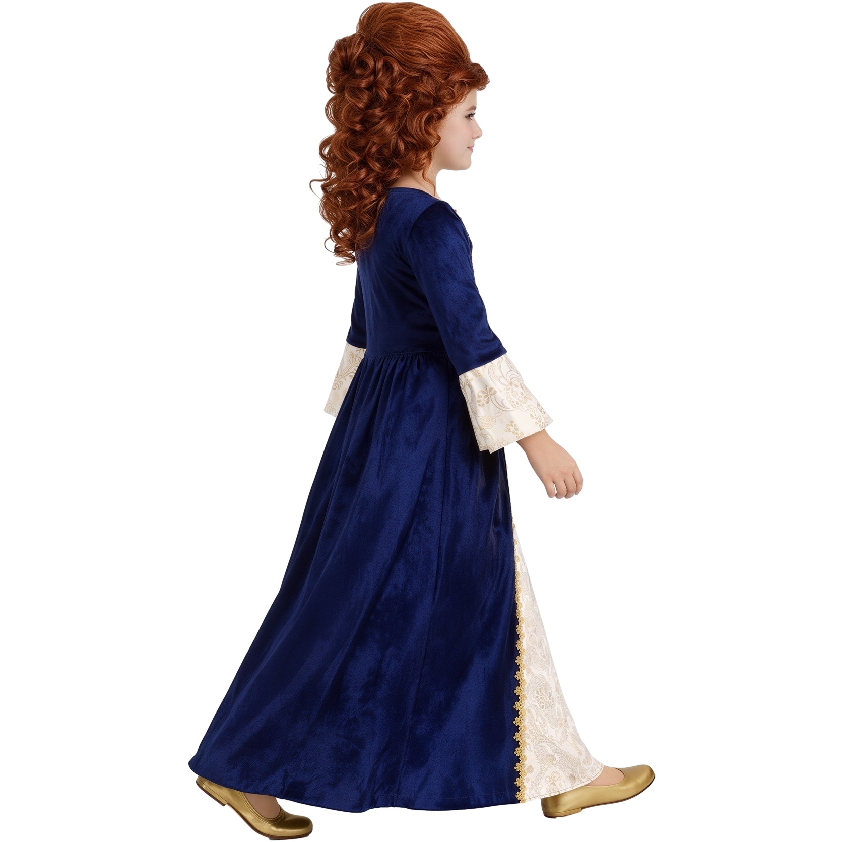 Ce déguisement pour fille se compose d'une chemise à manches longues et d'une jupe longue en bleu marine et crème, avec des bordures dorées et des motifs décoratifs sur la partie centrale et les poignets.