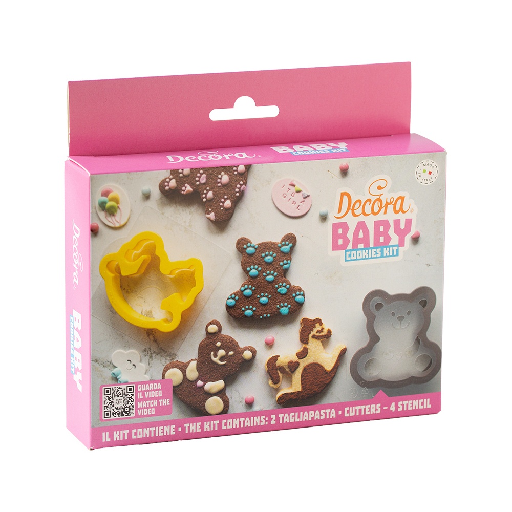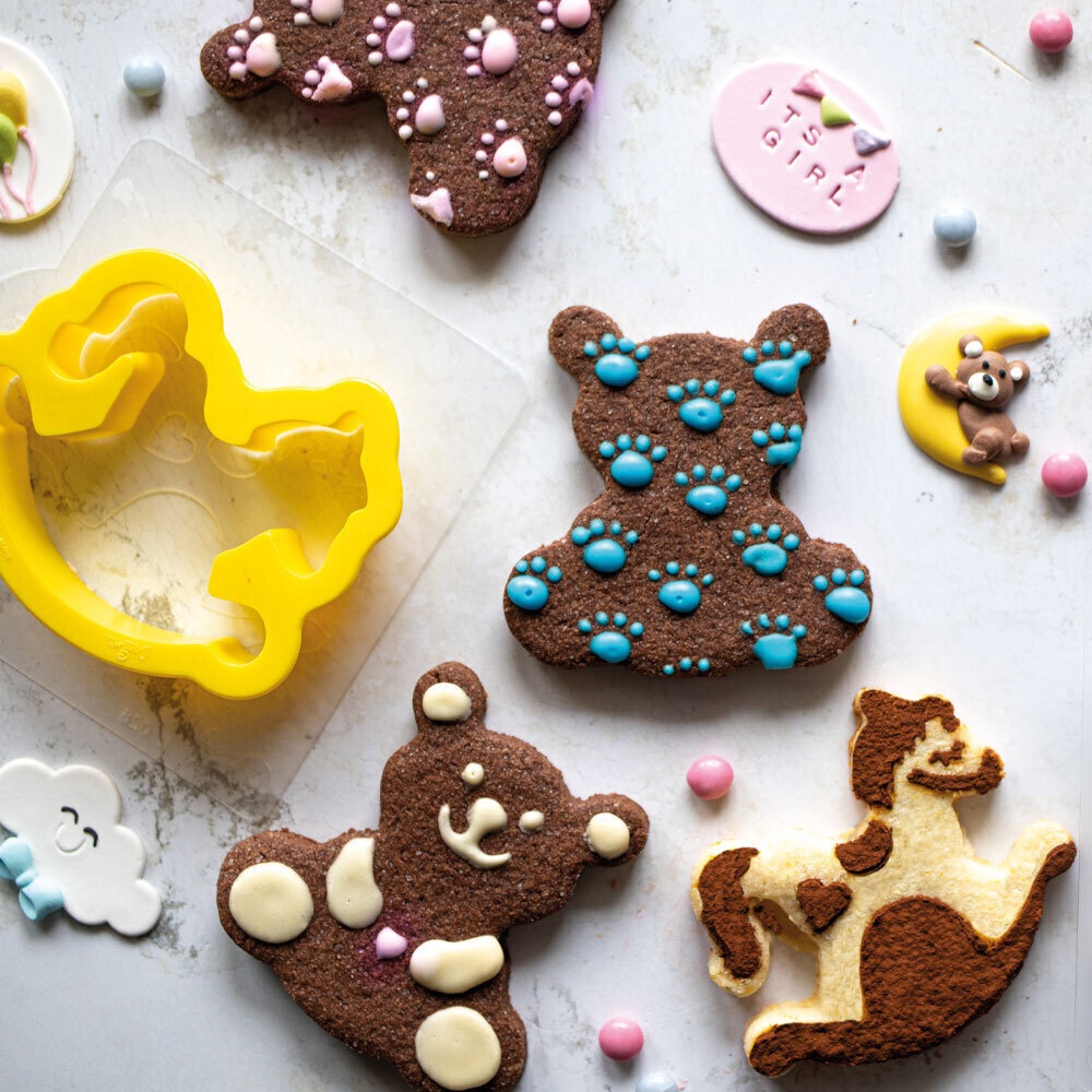 • Contenu: 2 emporte-pièces (cheval à bascule et ours) et 4 pochoirs décoratifs.