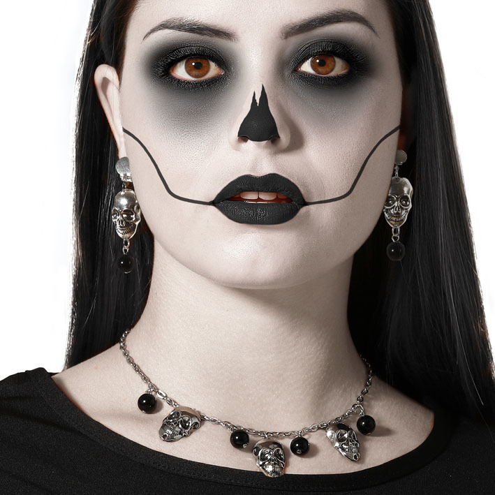 Ensemble de boucles d'oreilles et collier de crânes argentés