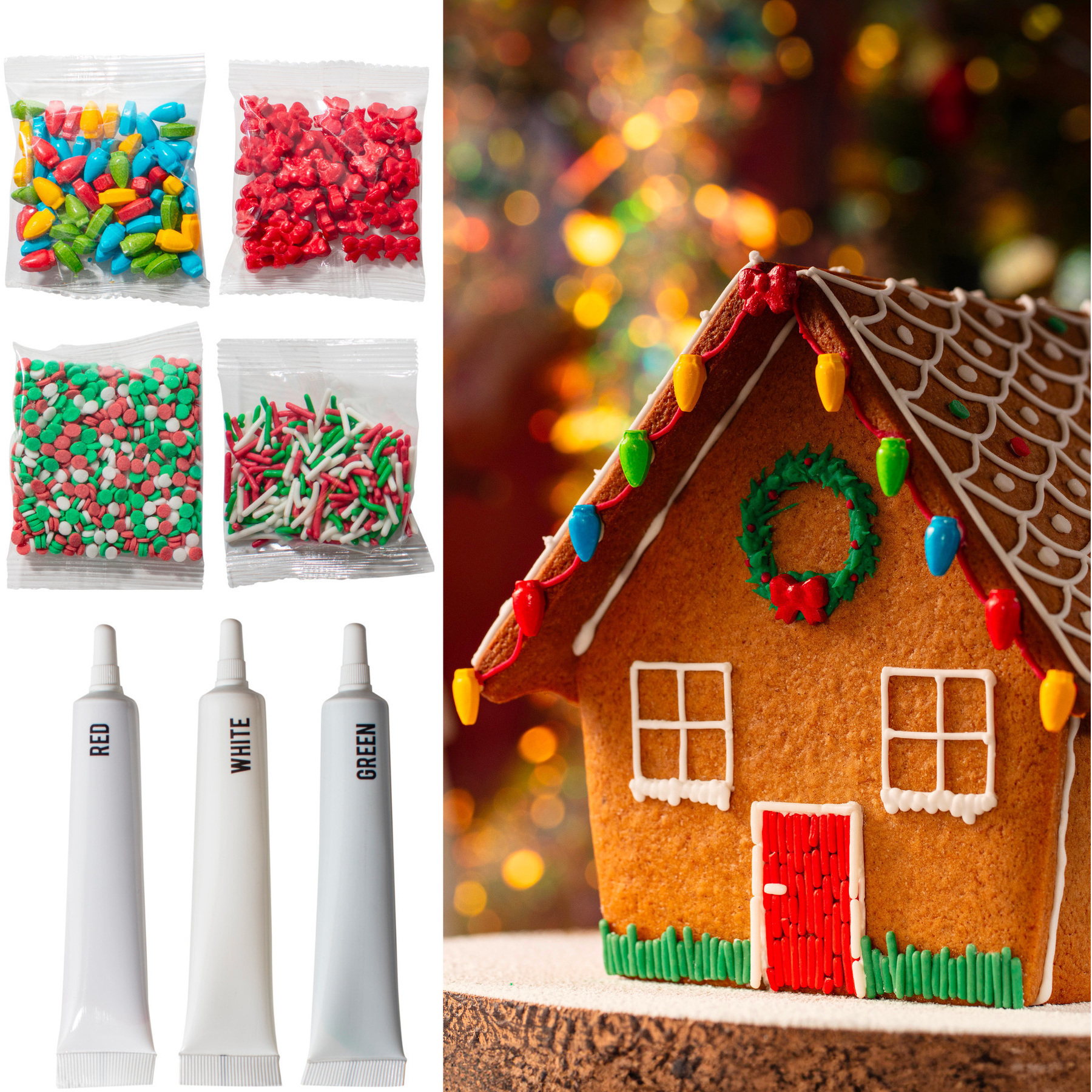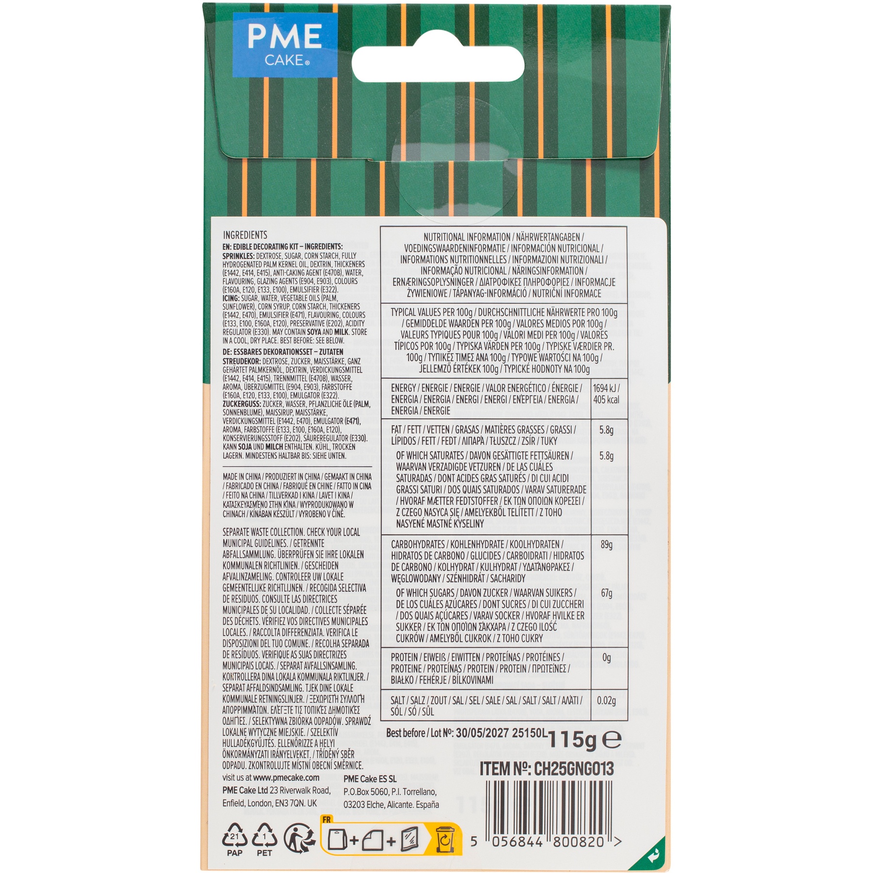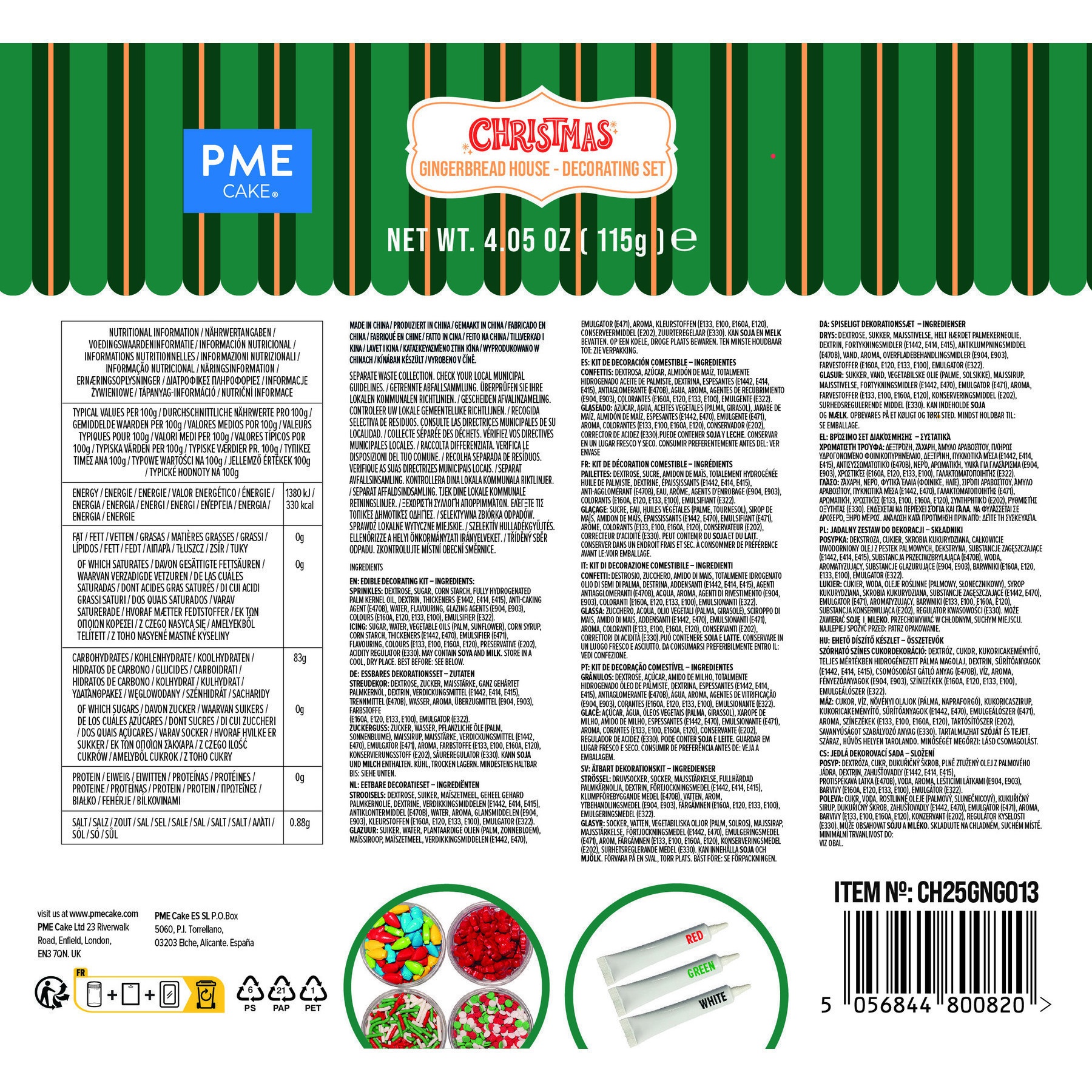 • Inclut: 3 tubes de glaçage de couleurs (blanc, vert et rouge) et 4 sachets de décorations (noeuds rouges, lumières de Noël, vermicelles et confettis blancs, verts et rouges).