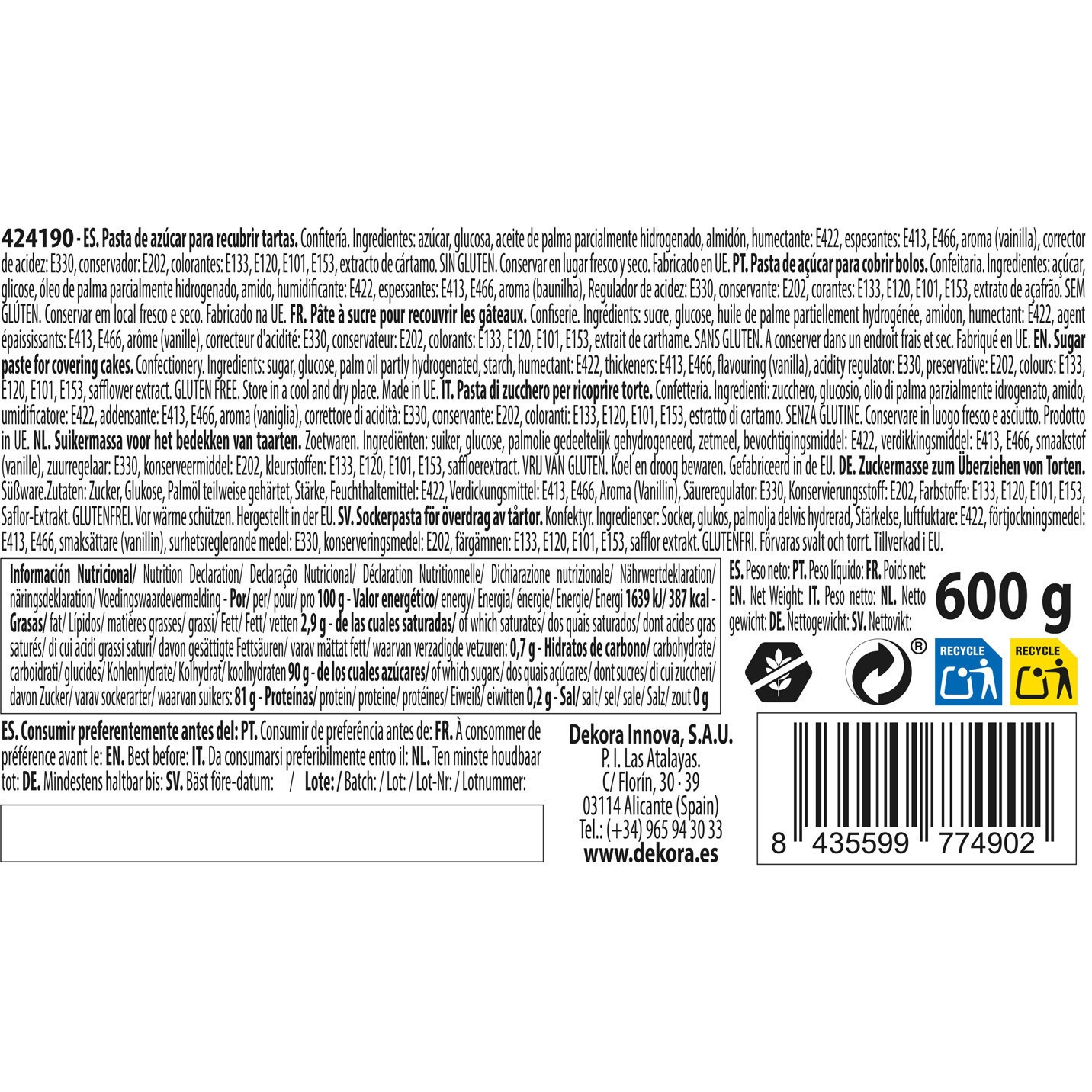 Ingrédients: Huile végétale partiellement hydrogénée, Amidon, Arôme (vanille), Sucre, Extrait de carthame, Glucose, Colorants: E101, E120, E133, E153, Épaississant: E413, E466, Humectant: E422, Acidifiant: E330, Conservateurs: E202.