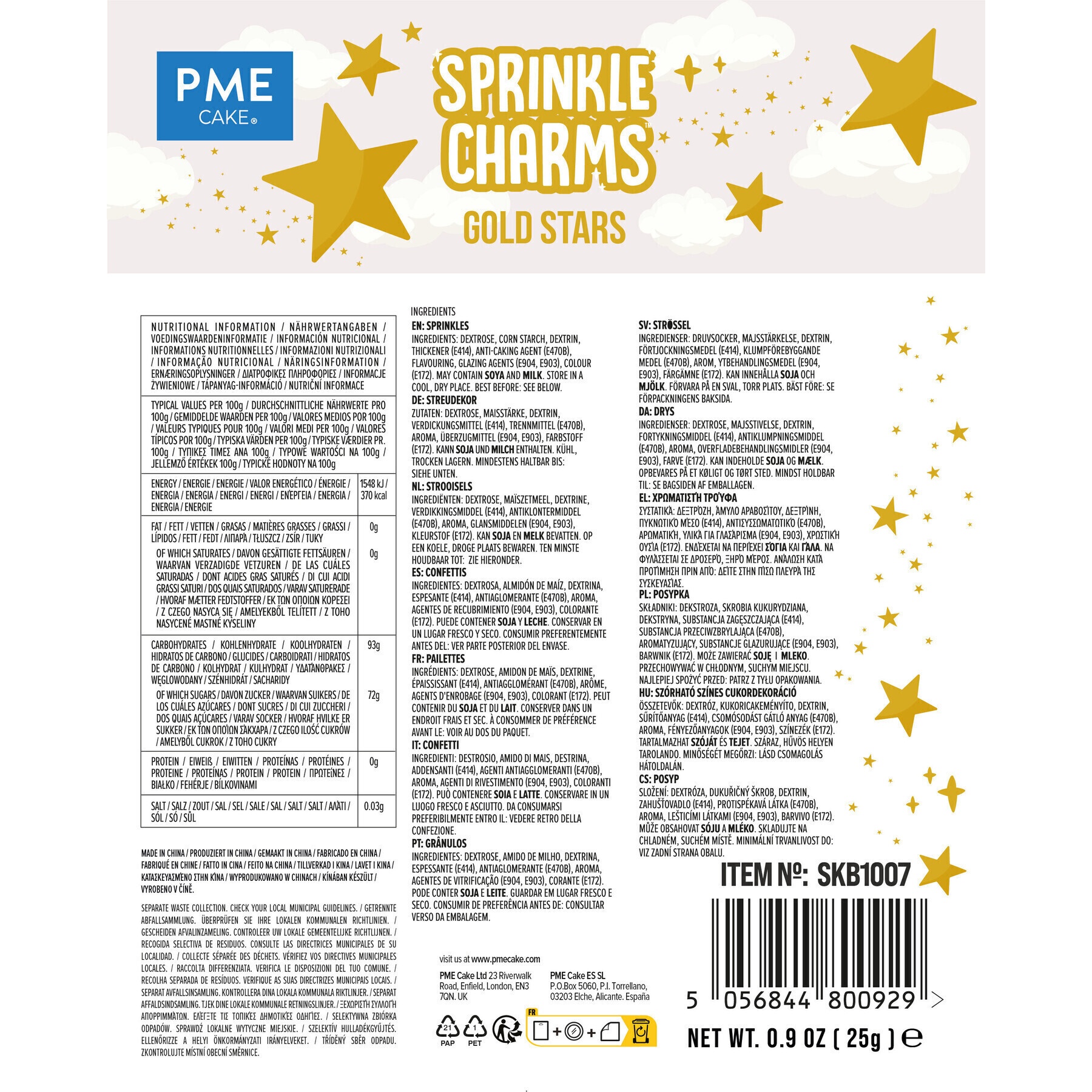 Ingrédients: dextrose, amidon de maïs, dextrine, épaississant (E414), anti-agglomérant (E470B), arôme, agents d'enrobage (E904, E903), colorant (E172).