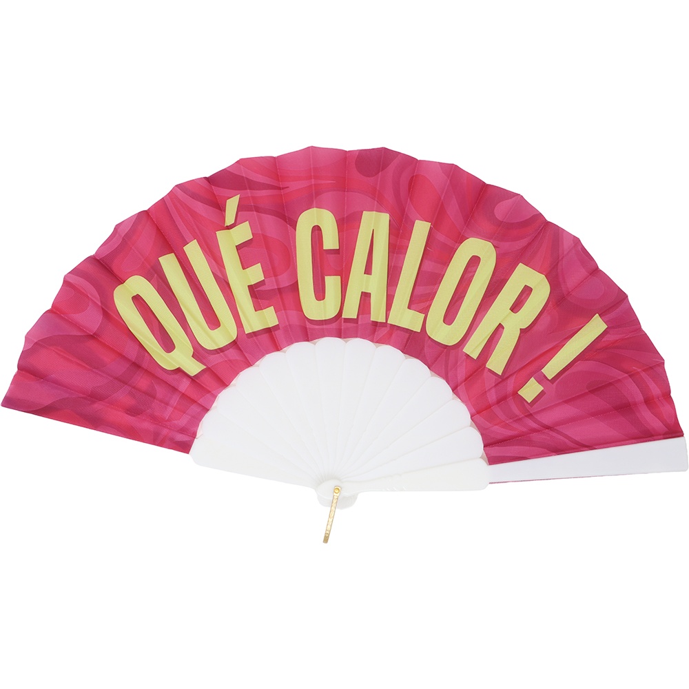 Éventail pliable rose portant le message QUÉ CALOR!, conçu pour apporter une touche amusante et audacieuse aux enterrements de vie de jeune fille et aux célébrations. Il s'ouvre aisément et prend peu de place dans votre sac jusqu'au moment de l'utiliser. Son design compact et voyant dynamise vos photos, photocalls et cadeaux de groupe.