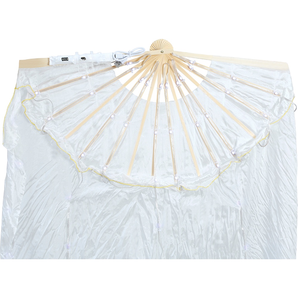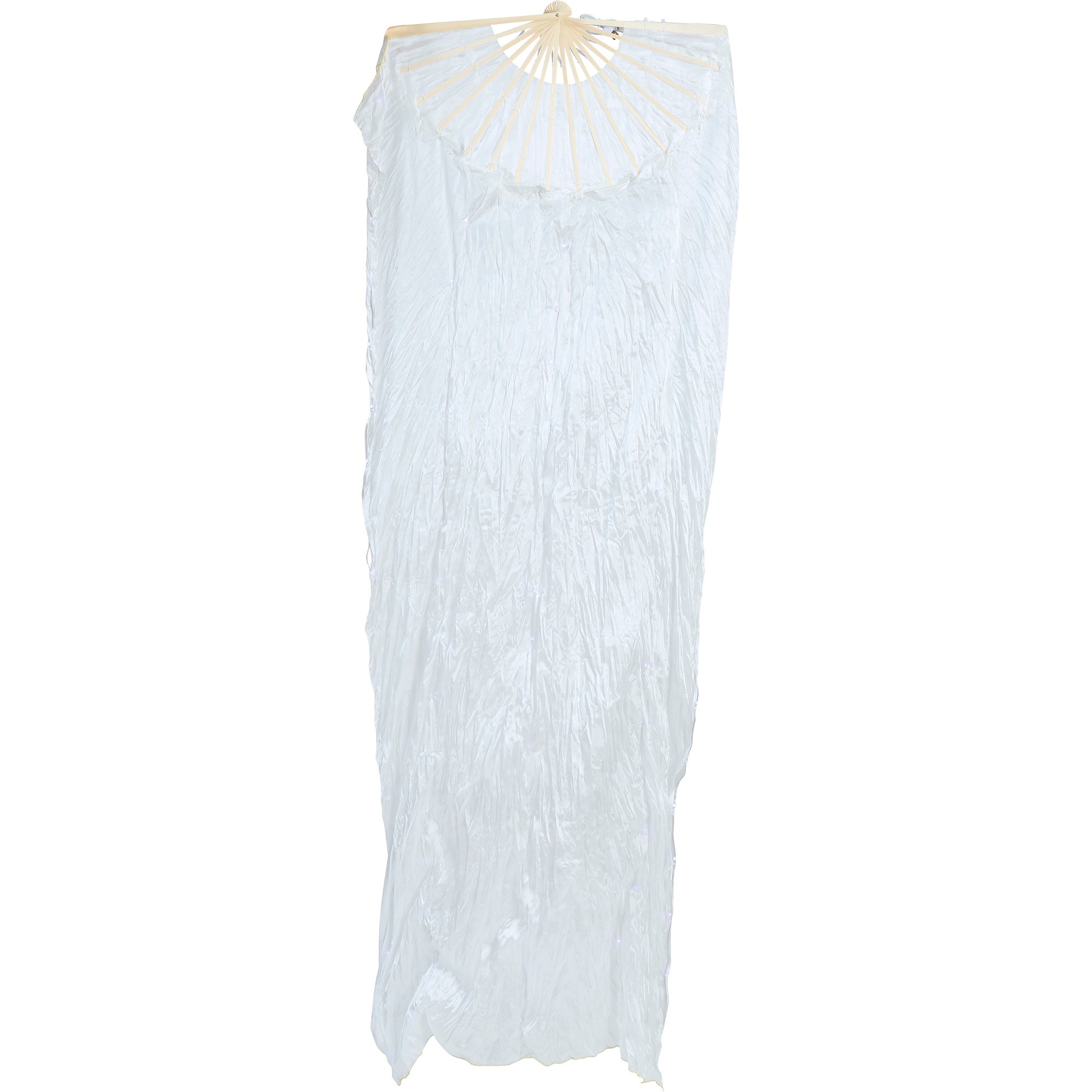 Éventail LED blanc au fort impact visuel, idéal comme accessoire pour déguisements, performances et fêtes. Son large format crée des mouvements élégants et des jeux de lumière qui mettent en valeur toute prestation ou séance photo. Les baleines en bois et le tissu polyester assurent un déploiement fluide et un tombé spectaculaire. Parfait pour apporter du drame et de la luminosité à votre tenue lors de carnavals, spectacles et événements nocturnes.