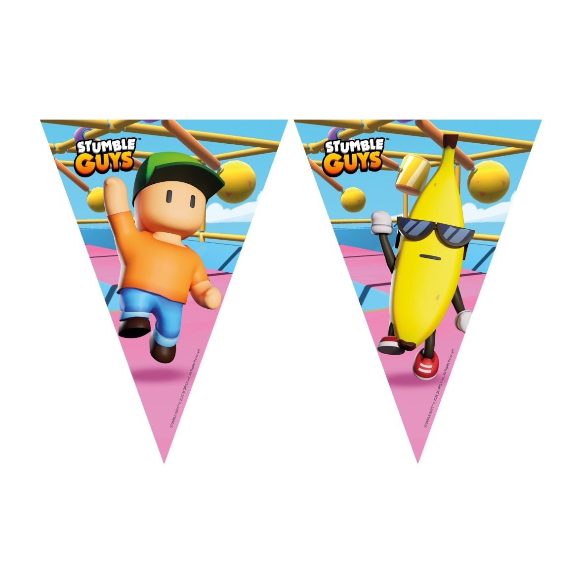 Décorez vos célébrations avec l'univers ludique de Stumble Guys. Fanion triangulaire aux motifs colorés et au design dynamique qui apporte énergie et ambiance jeux vidéo aux anniversaires d'enfants. Imprimé sur papier avec finition brillante pour des couleurs éclatantes. Présentation: 1 unité par pack.