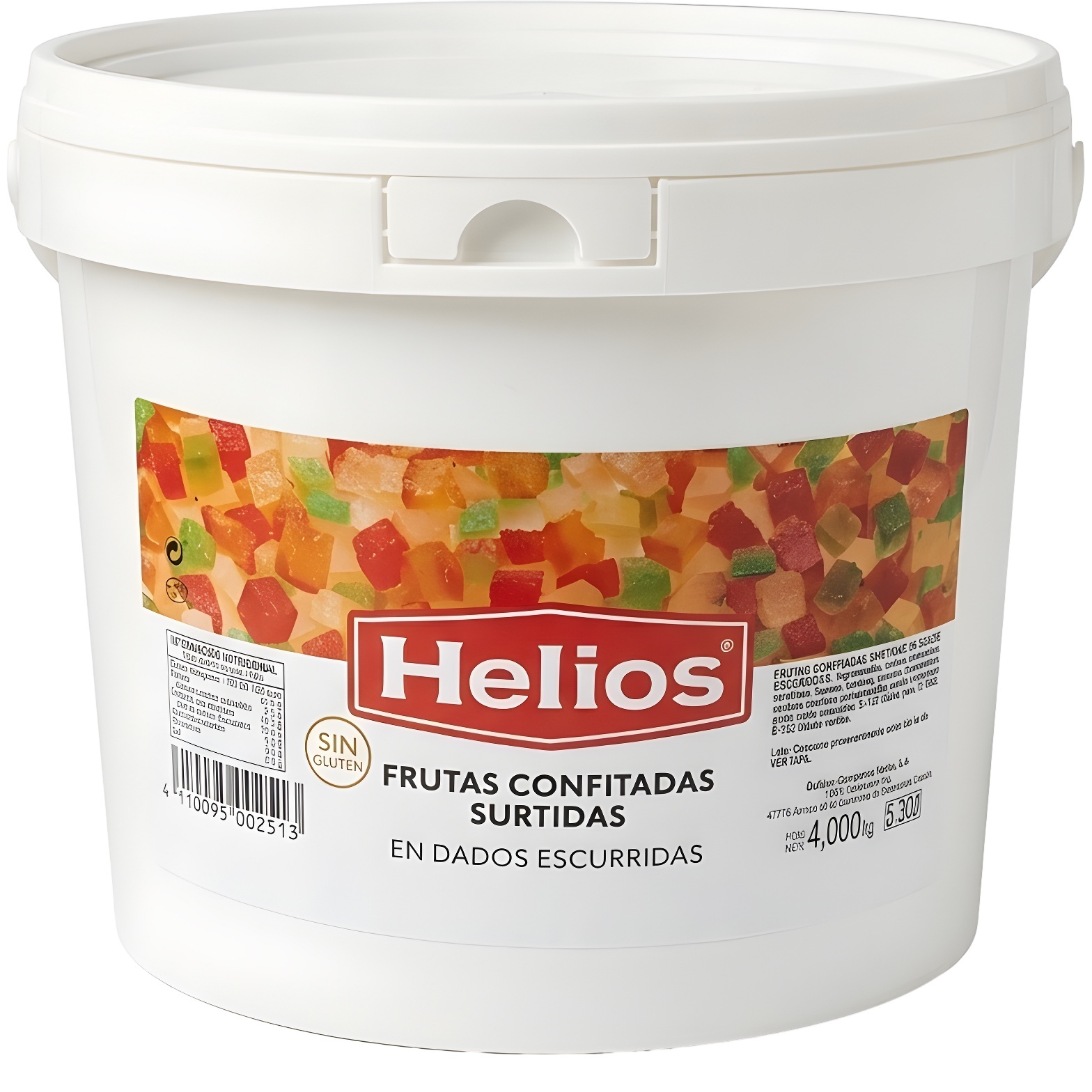 Conditionnement professionnel destiné à la boulangerie et à la pâtisserie: fruits confits en dés prêts à être incorporés dans pâtes et garnitures.