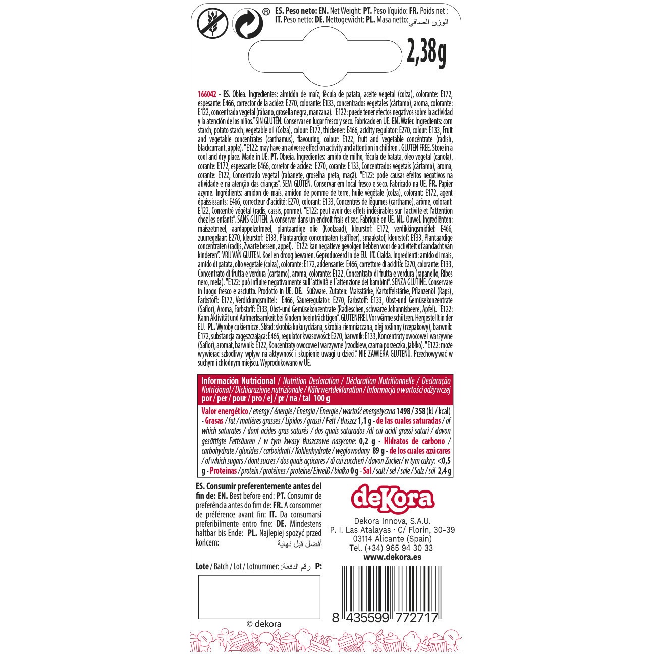 Ingrédients: Huile de colza, Amidon de maïs, Fécule de pomme de terre, Colorants: E122, E133, E172, Correcteur d'acidité: E270, Concentré végétal: Carthame, Cassis, Pomme, Radis, Arôme: Vanille.