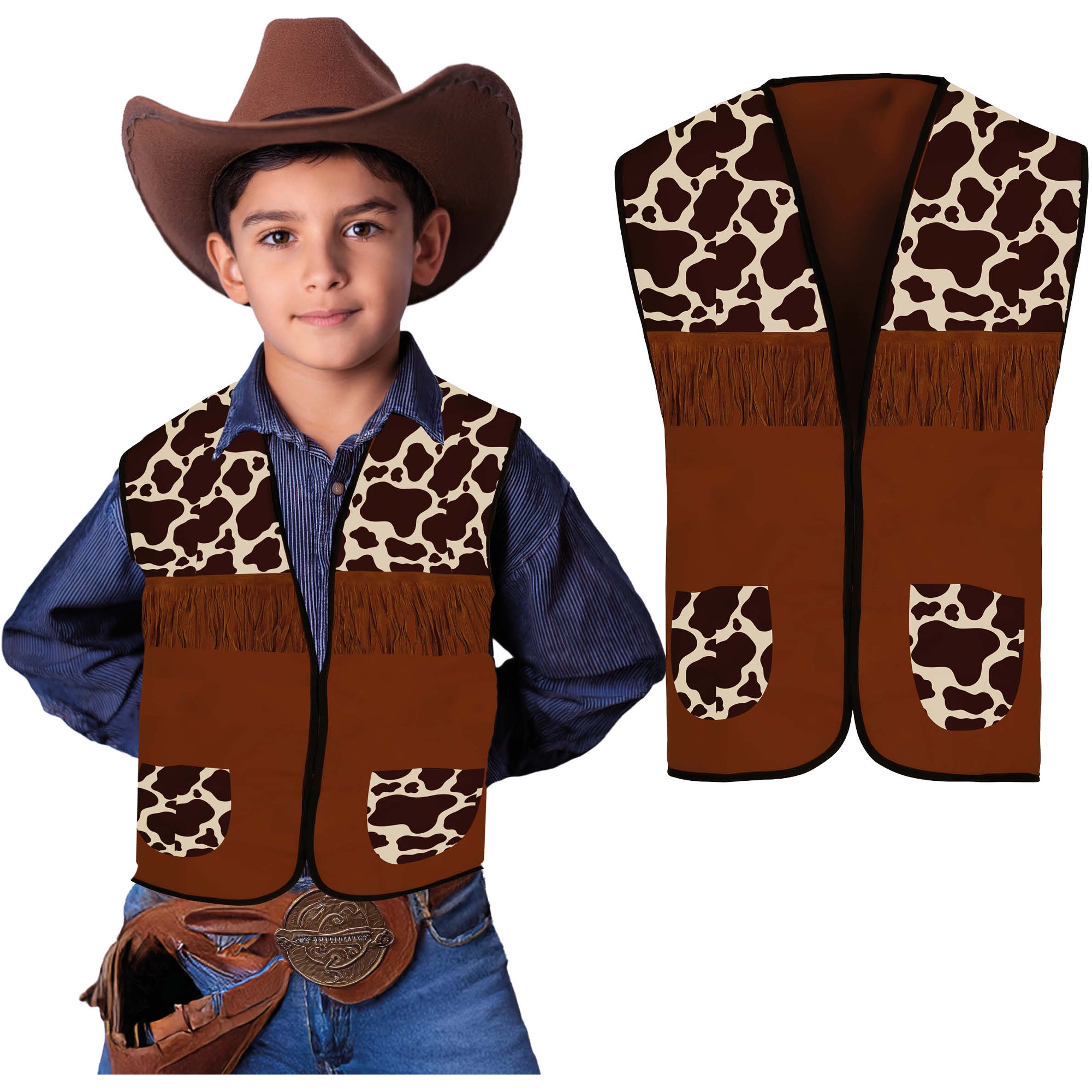 Gilet cow-boy pour enfant avec motif imitation peau de vache et franges décoratives, apportant une touche amusante et authentique à la tenue.