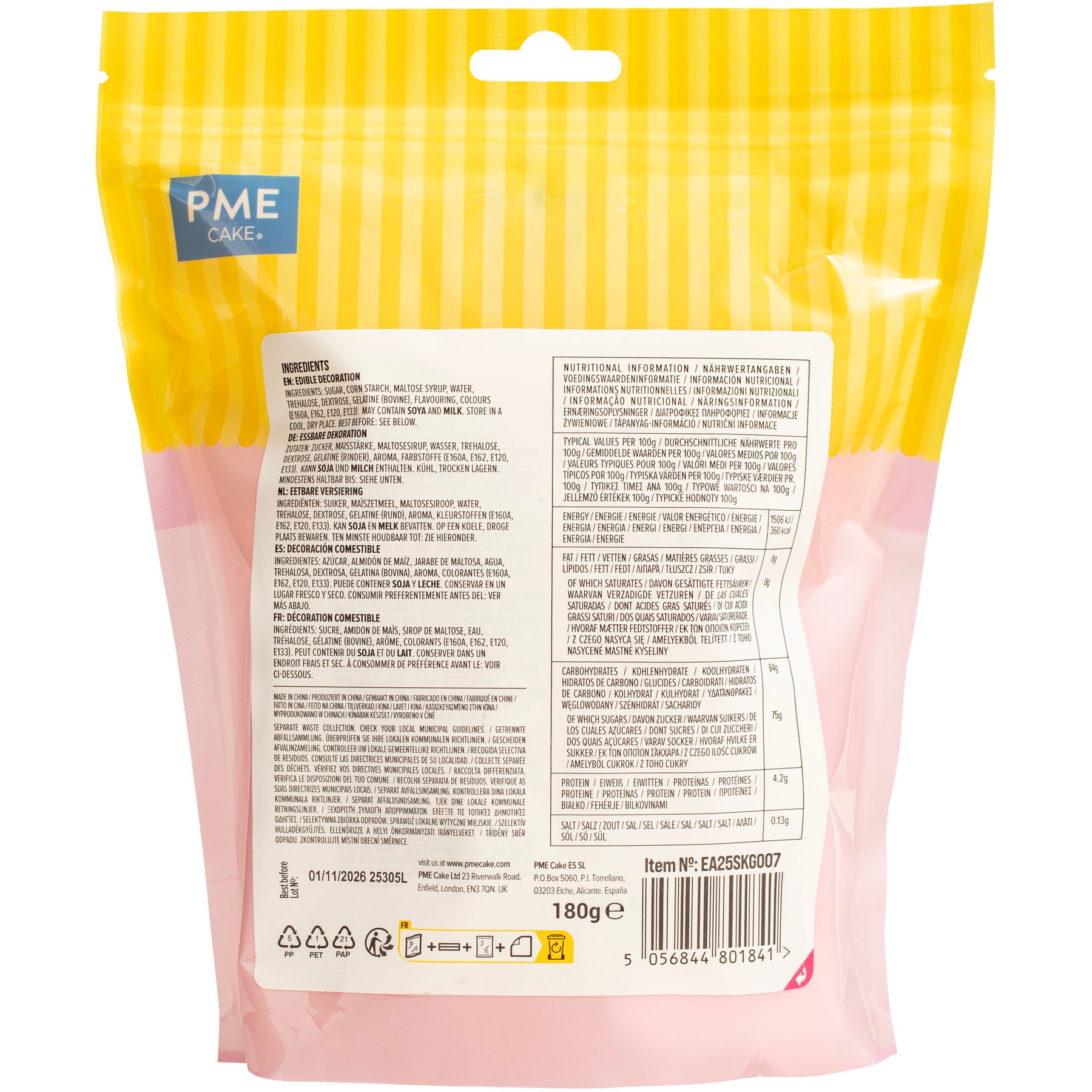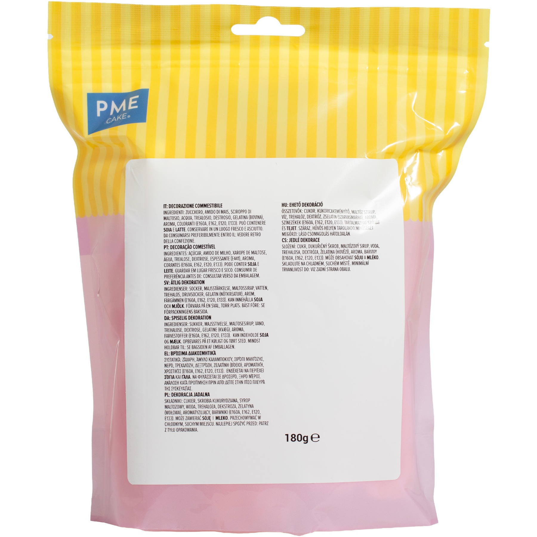Ingrédients: sucre, amidon de maïs, sirop de maltose, eau, tréhalose, dextrose, gélatine (bovine), arôme, colorants (E160A, E162, E120, E133).