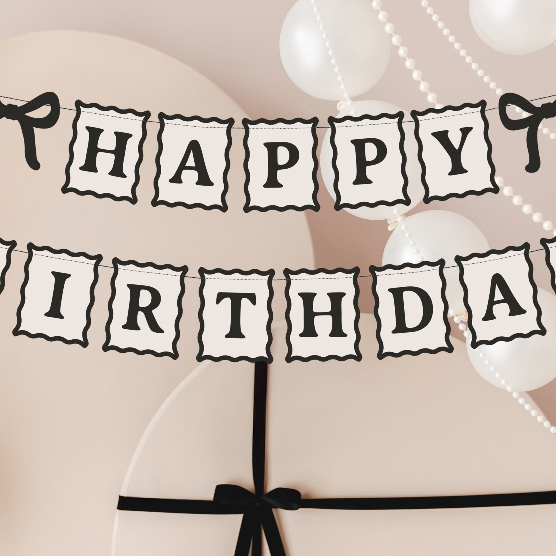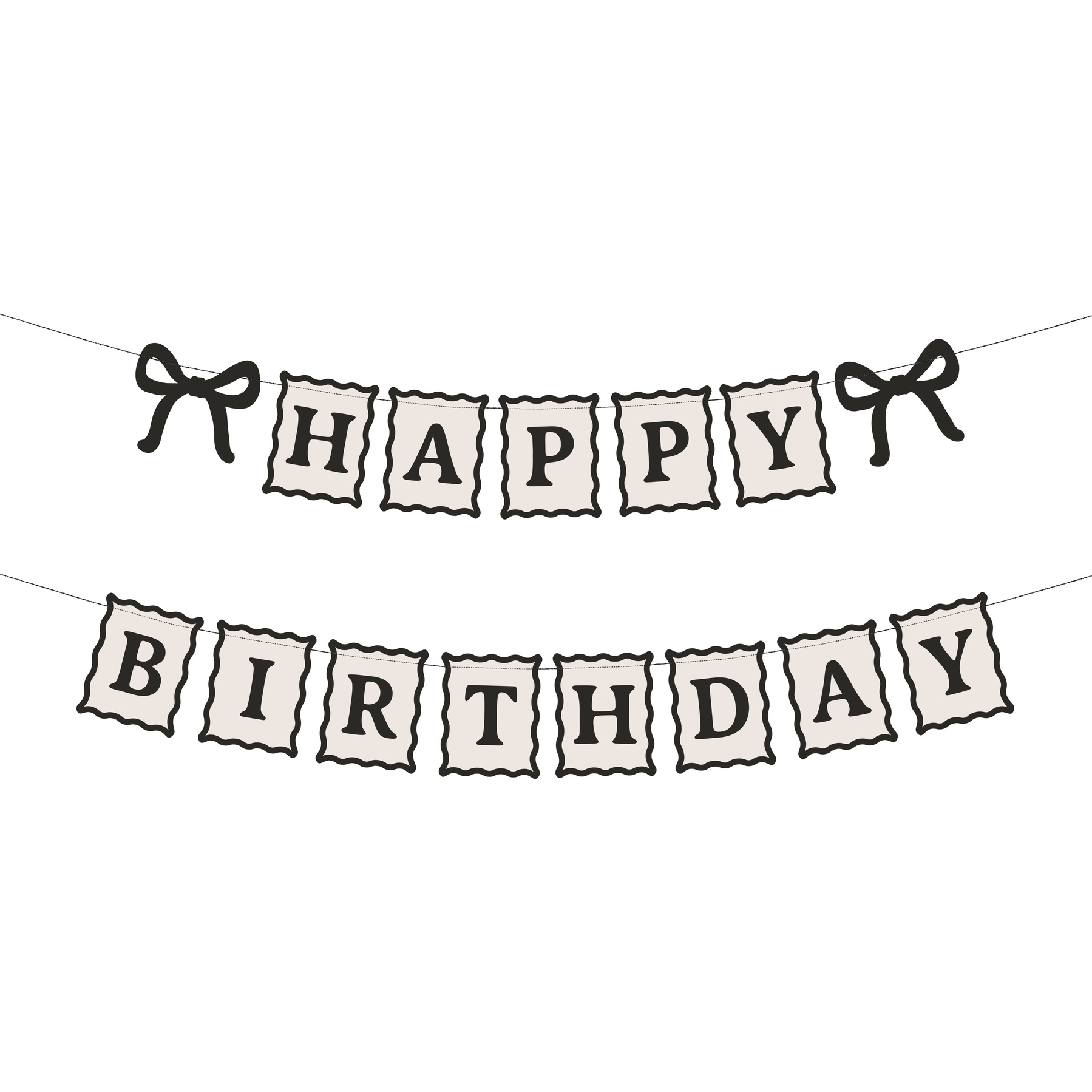 Guirlande "Happy Birthday" avec noeuds dans des tons crème et noir, elle apporte une touche sophistiquée à toutes vos célébrations. Elle mesure environ 100 cm et est livrée prête à l'emploi. Les lettres sont posées sur des panneaux en papier au bord festonné et sont reliées par un cordon noir cousu, ce qui facilite l'accrochage. Design discret et élégant, compatible avec des décors pour adultes comme pour enfants.