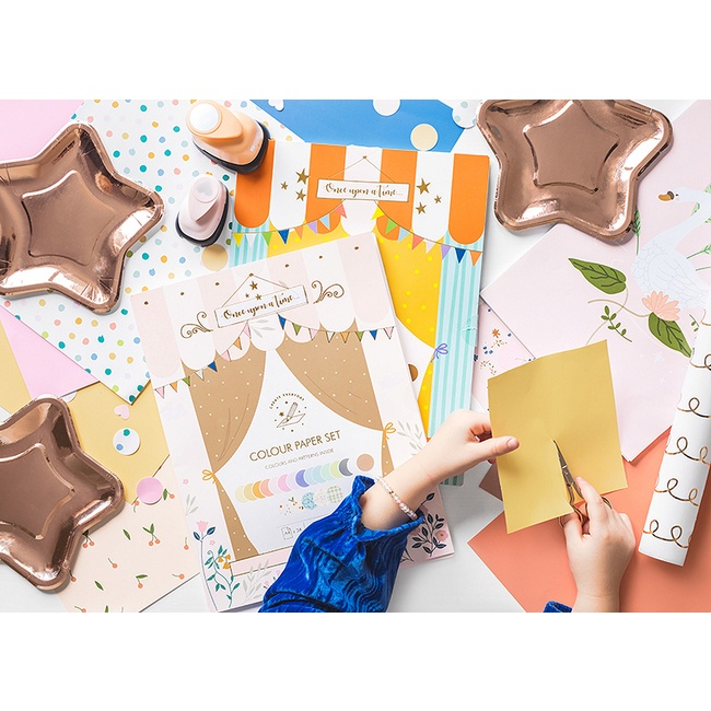 Paquet composé de 34 feuilles assorties format DIN A4 de couleurs et imprimés avec lesquelles les enfants pourront s'amuser à réaliser des bricolages.