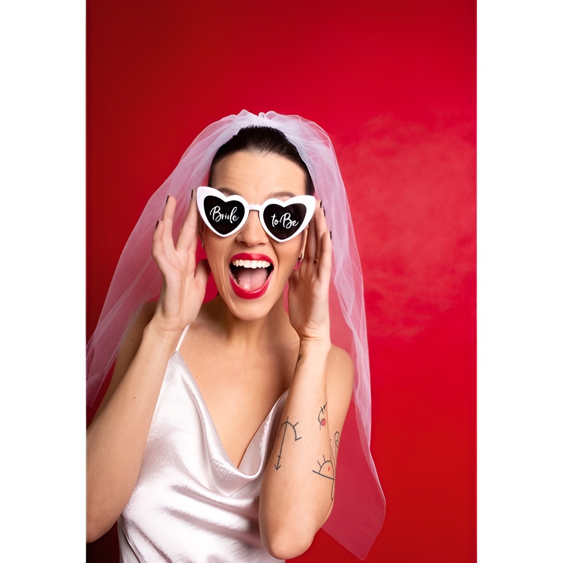 Lunettes en forme de coeur avec l'inscription "Bride to Be" en contraste blanc et verres noirs, pour une touche à la fois amusante et élégante. Leur design accrocheur est pensé pour les enterrements de vie de jeune fille et tous vos moments de célébration. Dimensions compactes garantissant un ajustement sûr et confortable pendant la fête.
