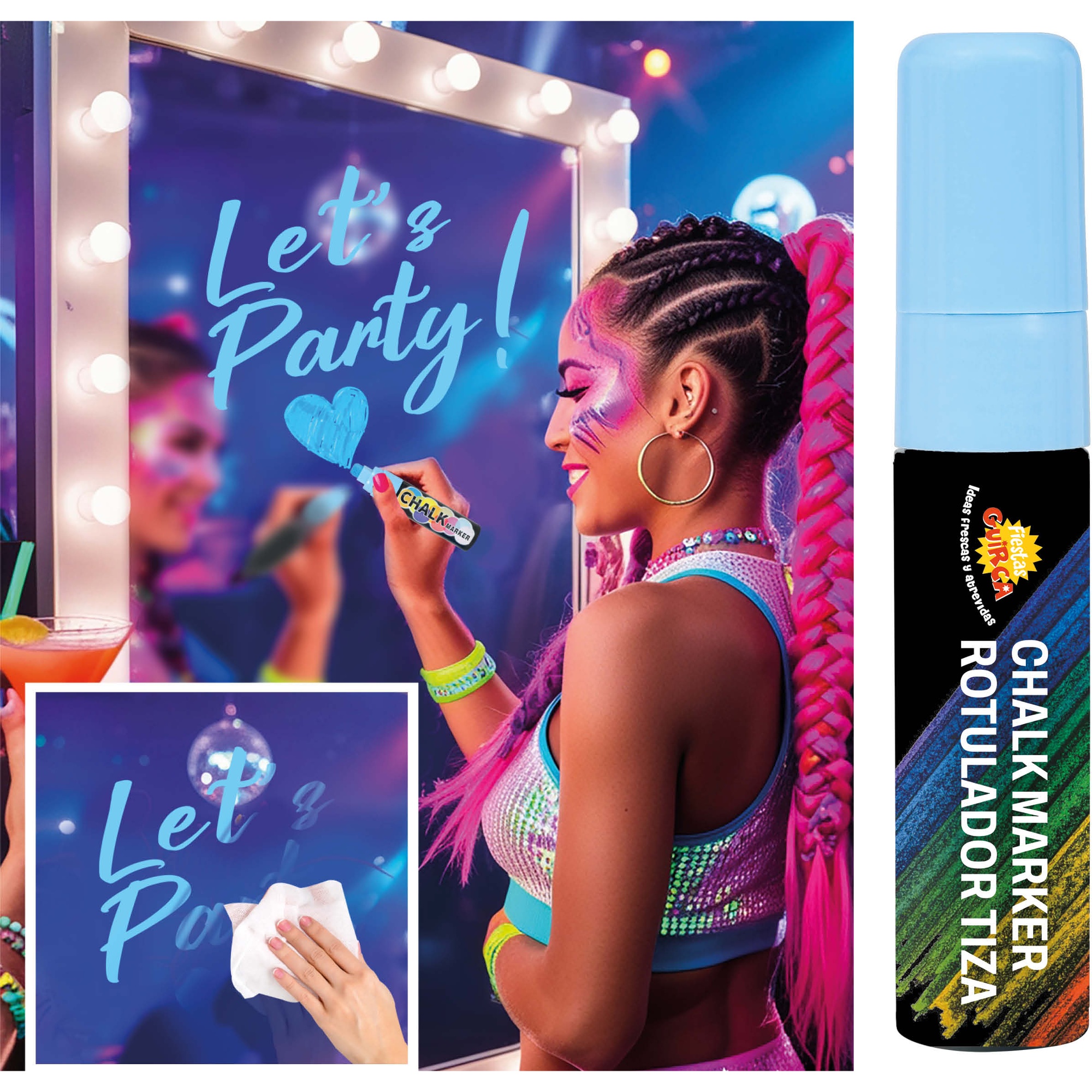 Marqueur craie liquide bleu conçu pour décorer miroirs et surfaces en verre avec des tracés nets et des couleurs vives. Son format marqueur vous permet de dessiner lettres, formes et détails avec un grand contrôle. Il fonctionne sur des surfaces non poreuses telles que miroirs, vitrines et tableaux, offrant un fini brillant qui sublime toute ambiance festive. Idéal pour créer des messages temporaires, de la signalisation et des décorations accrocheuses lors de vos événements.