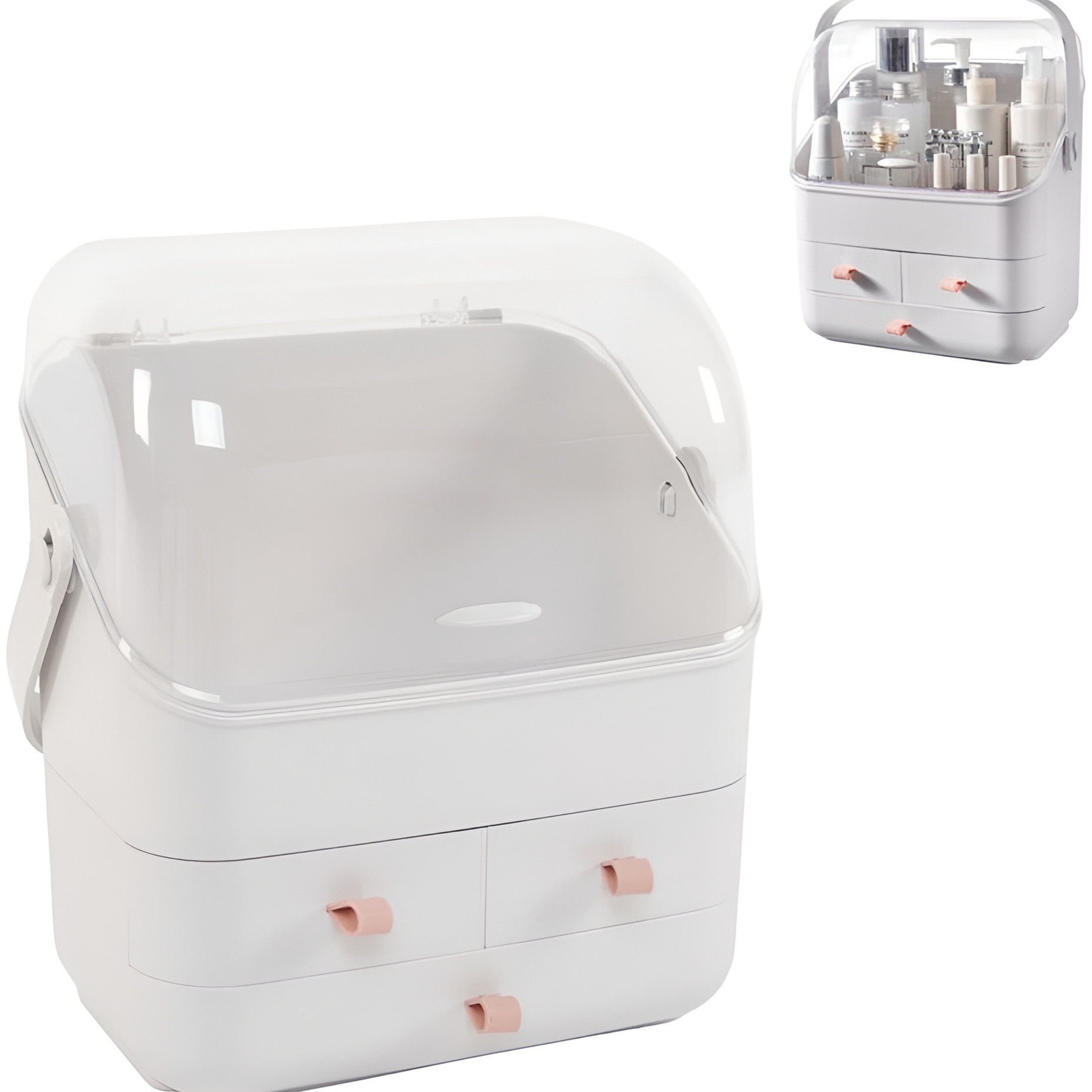 Organisateur de cosmétiques conçu pour garder vos produits à portée de main et visibles, avec un design soigné et fonctionnel. Son couvercle transparent anti-poussière permet d'identifier le contenu sans l'ouvrir, tandis que les tiroirs offrent des espaces séparés pour tout organiser. Compact et doté d'une poignée latérale pour faciliter son transport, il apporte une touche moderne et ordonnée à votre coiffeuse.