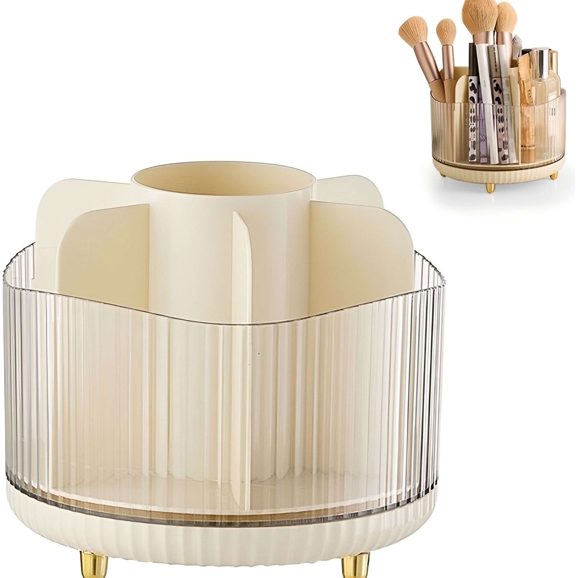 Organisez et accédez facilement à vos pinceaux et produits de maquillage grâce à cet organisateur rotatif 360°. Son design compact et élégant apporte de l'ordre à votre coiffeuse et vous permet de trouver chaque outil en un instant. Il est doté de compartiments de hauteurs variées pour séparer pinceaux, crayons et flacons, en conservant tous les éléments visibles et accessibles. Un accessoire à la fois fonctionnel et décoratif qui améliore votre routine maquillage quotidienne.