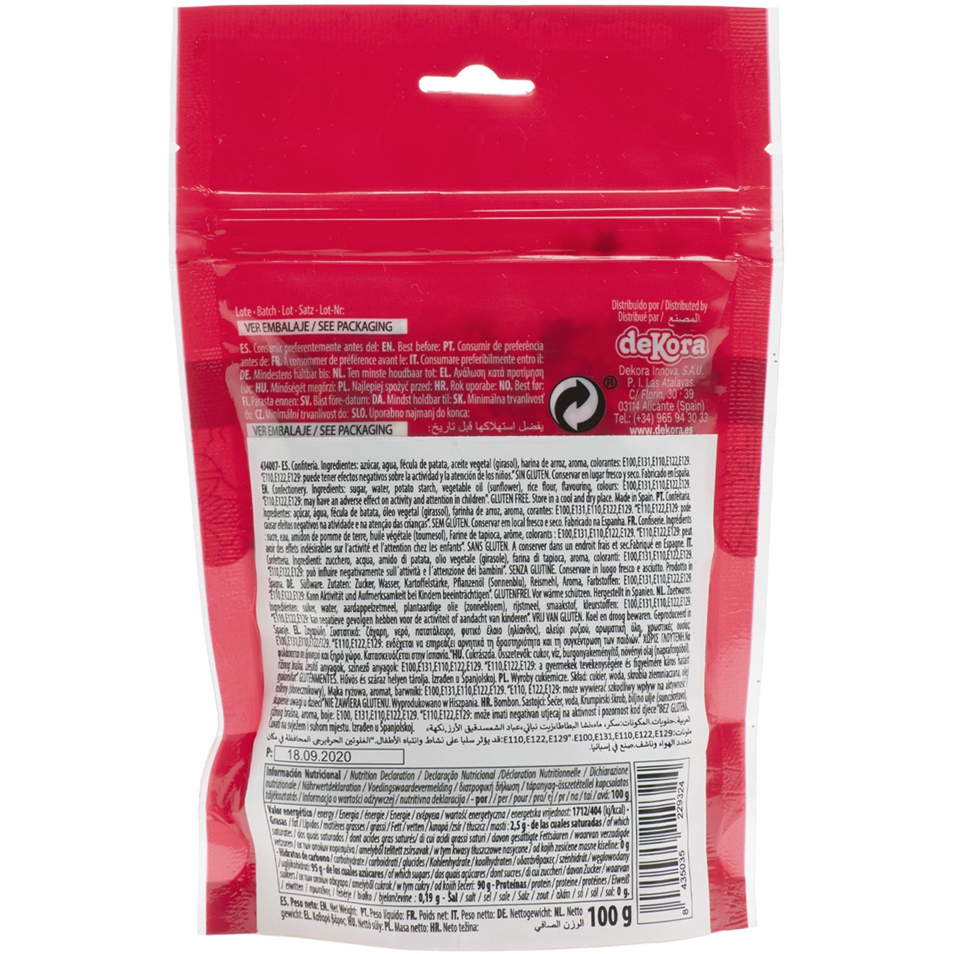 Ingrédients: Huile de tournesol à haute teneur en oléique, Eau, Amidon de pomme de terre, Sucre glace, Farine de riz, Colorants: E100, E110, E122, E129, E133, Arôme: Vanilline.