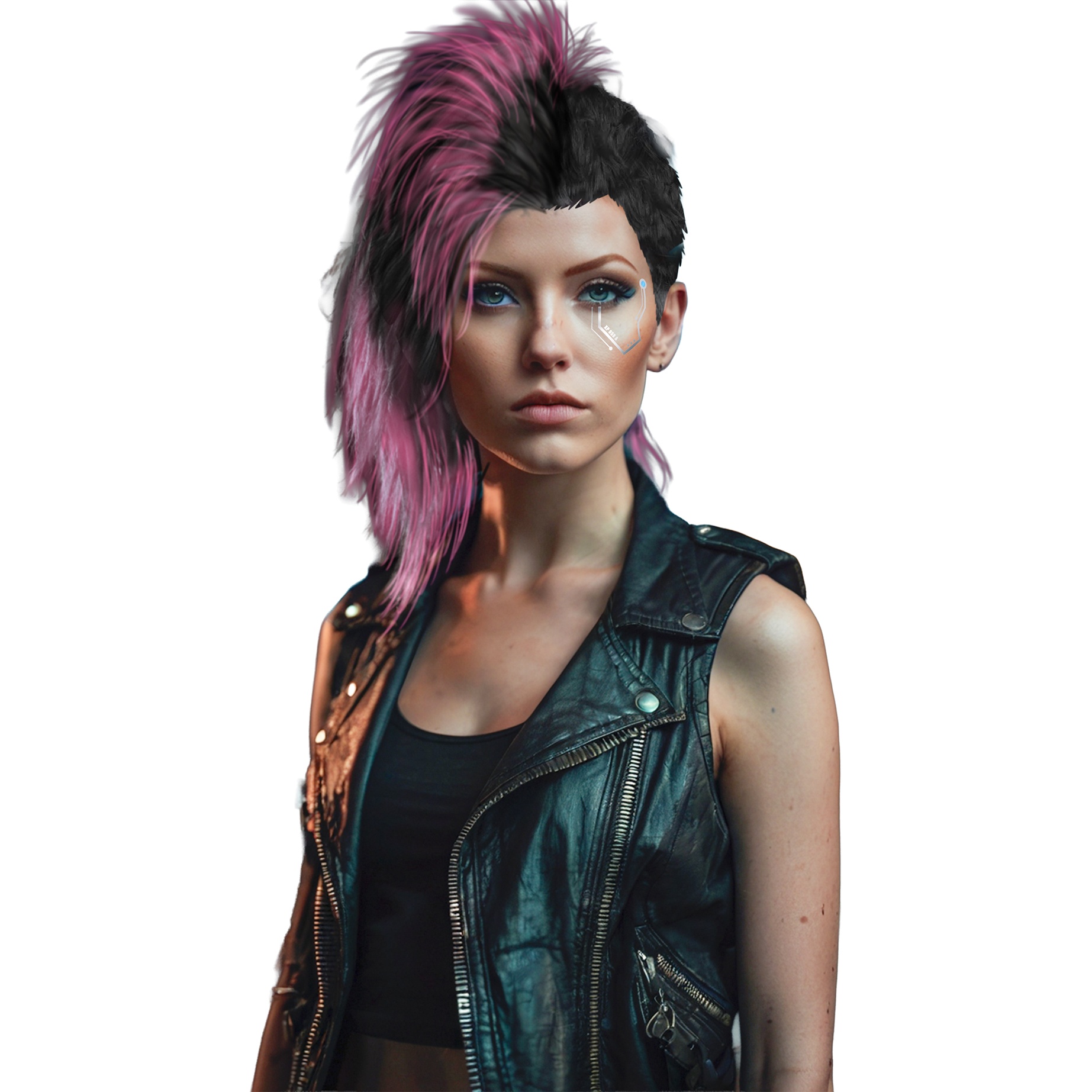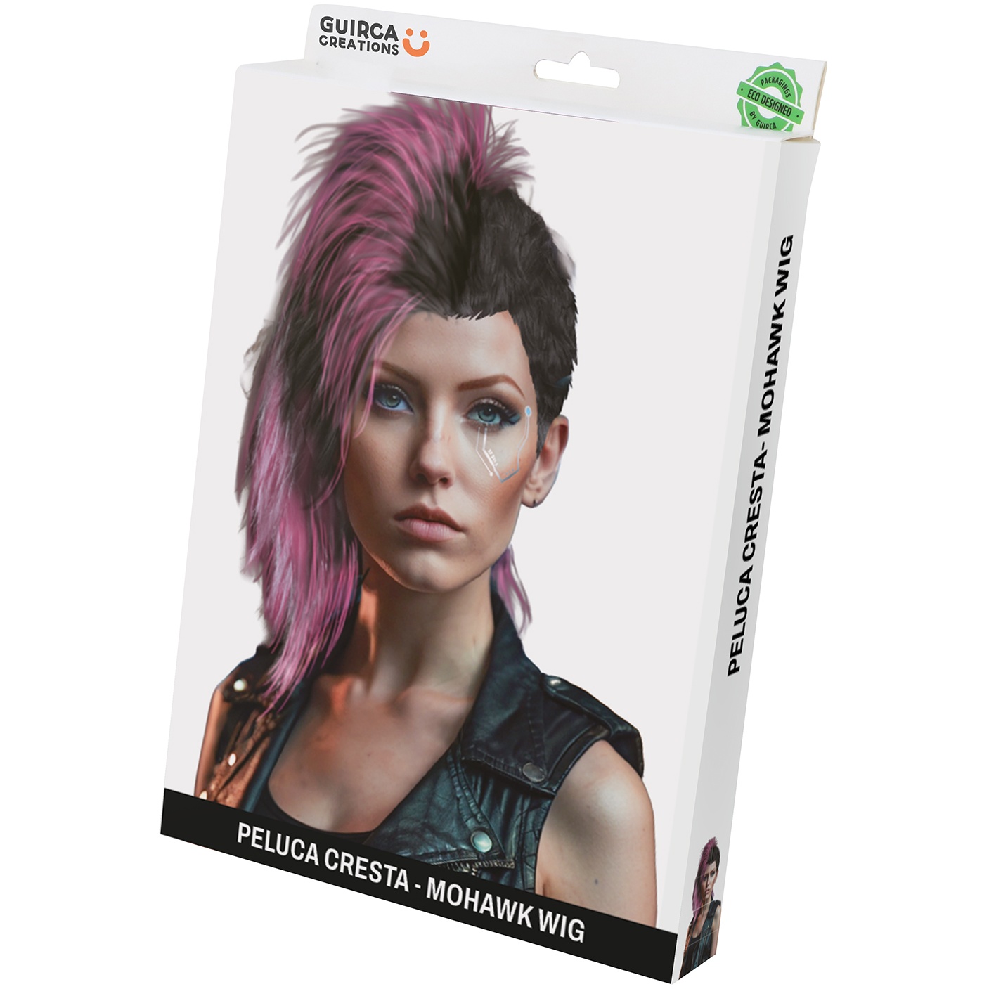 - Style punk avec une crête haute aux tons rose et noir pour un impact visuel immédiat.