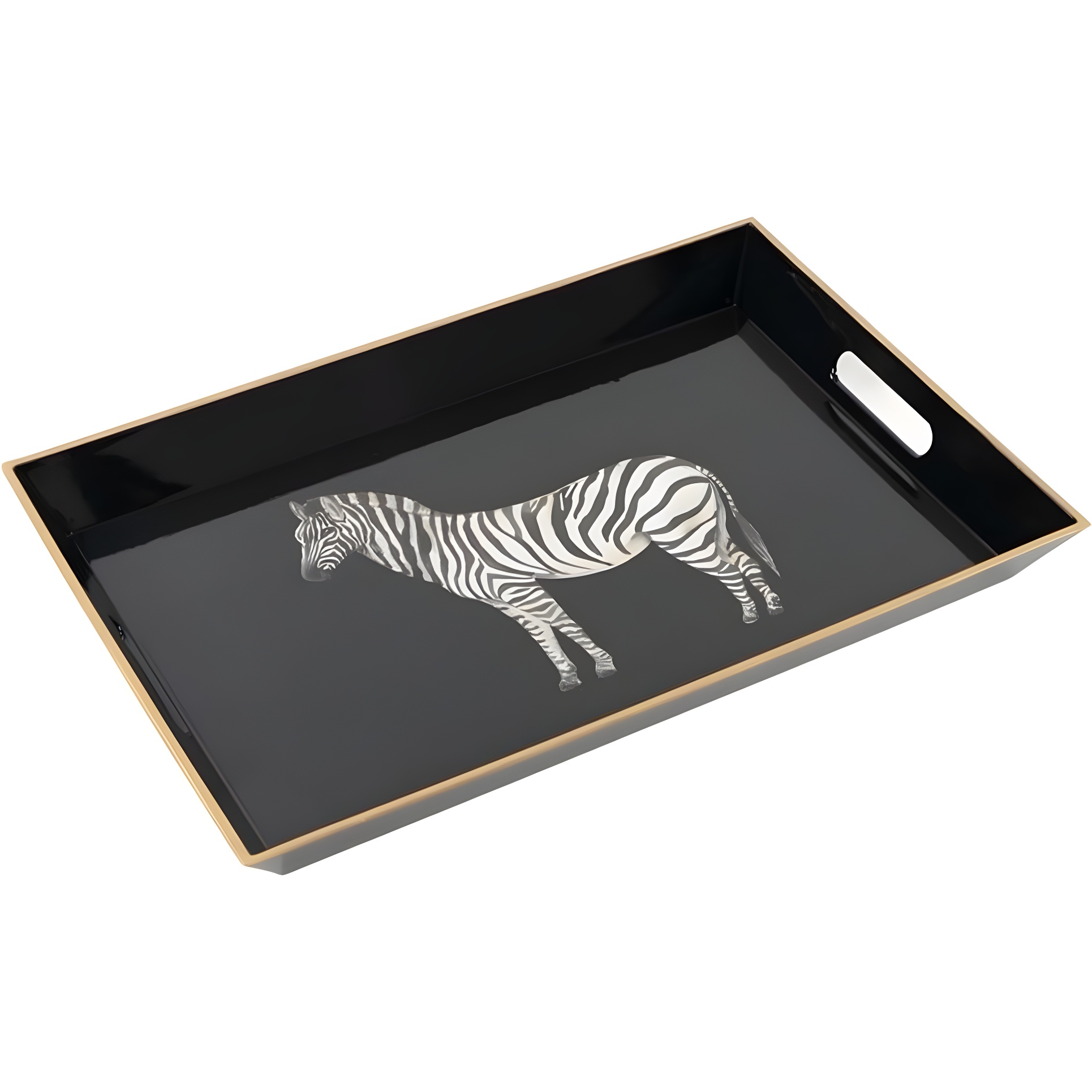 Élégant plateau décoratif noir, orné d'une illustration de zèbre et d'une bordure dorée, qui apporte une touche sophistiquée à votre intérieur.