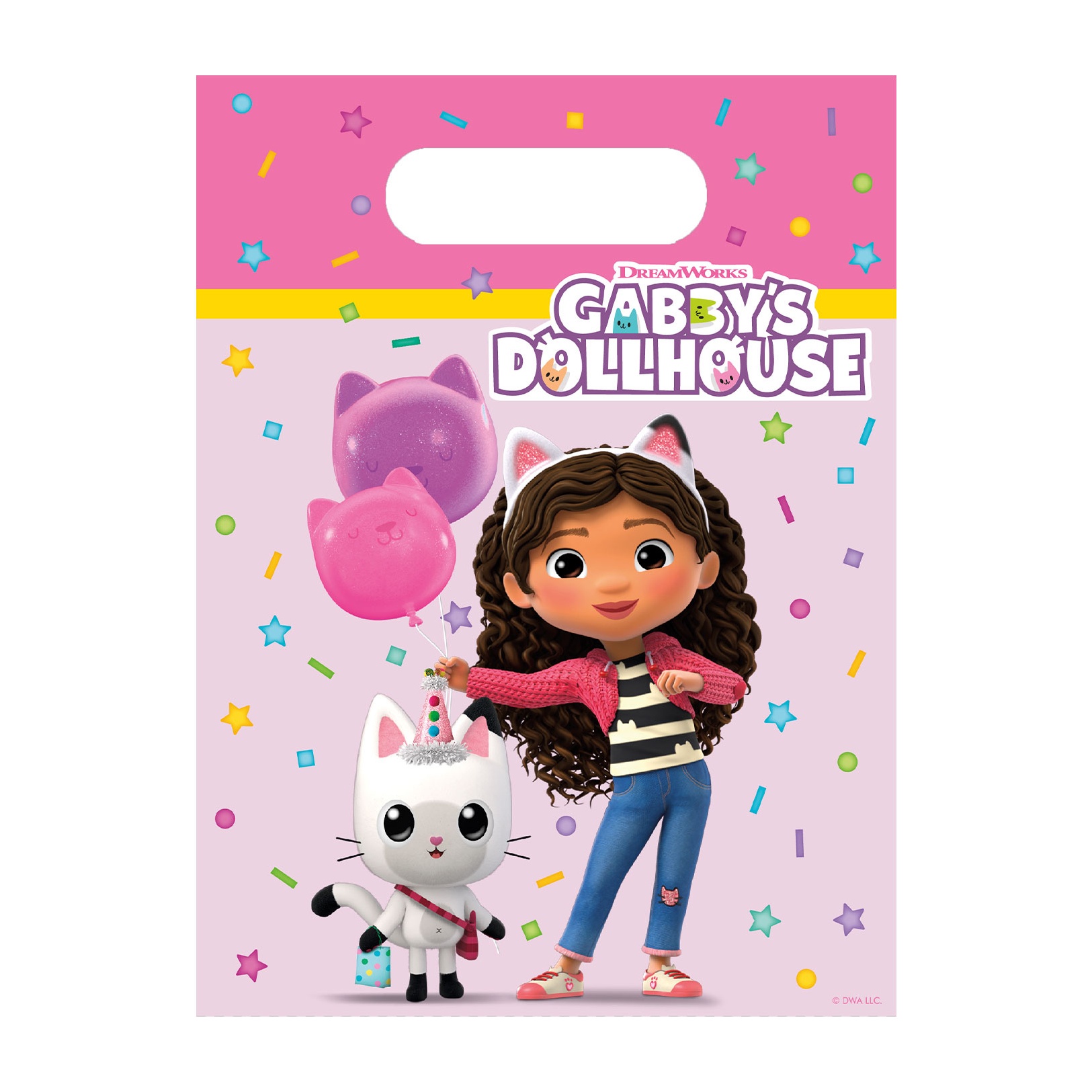Sacs de fête au design inspiré de Gabby's Dollhouse, parfaits pour apporter une touche ludique et colorée à toute célébration pour enfants. Ils présentent des illustrations des personnages et des confettis dans des tons joyeux qui raviront les plus jeunes. Dotés d'anses découpées, ils offrent un transport confortable et un format léger pensé pour vous faciliter la préparation des sachets cadeaux et des souvenirs de fête.