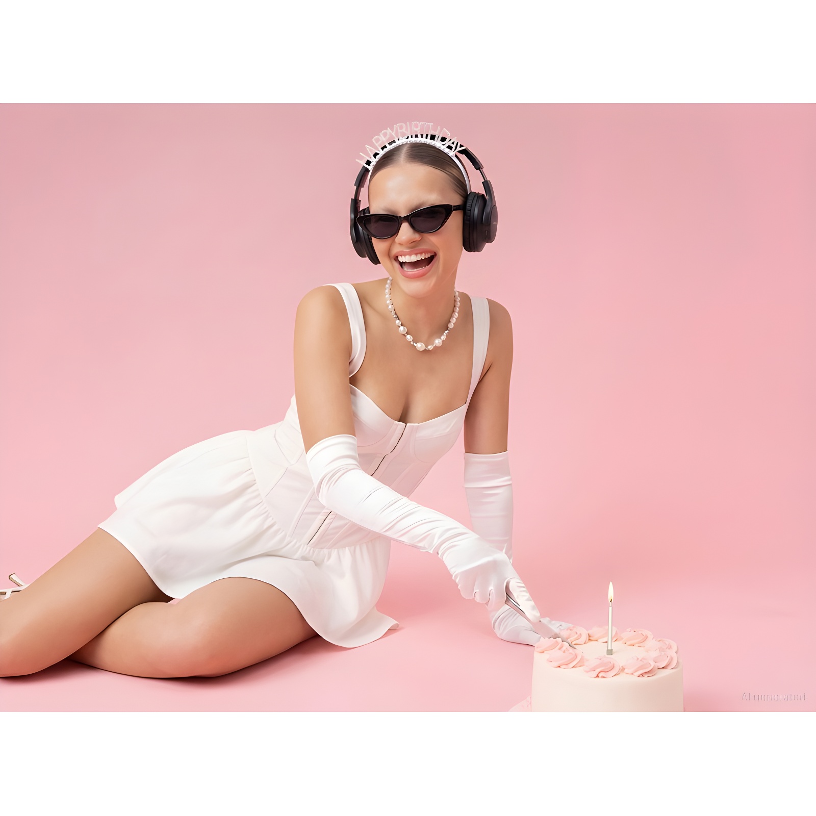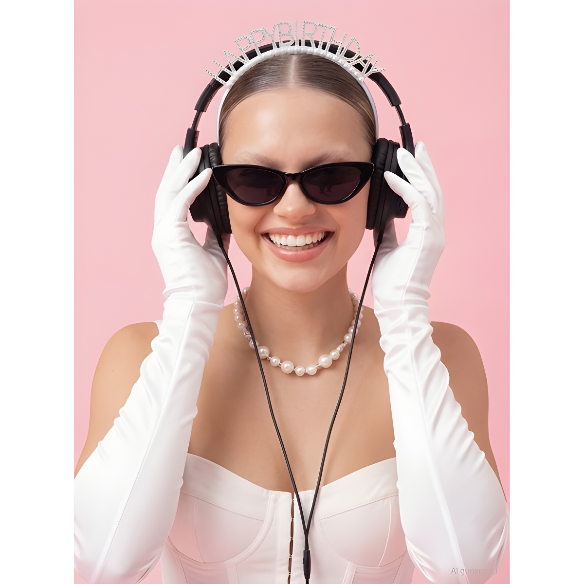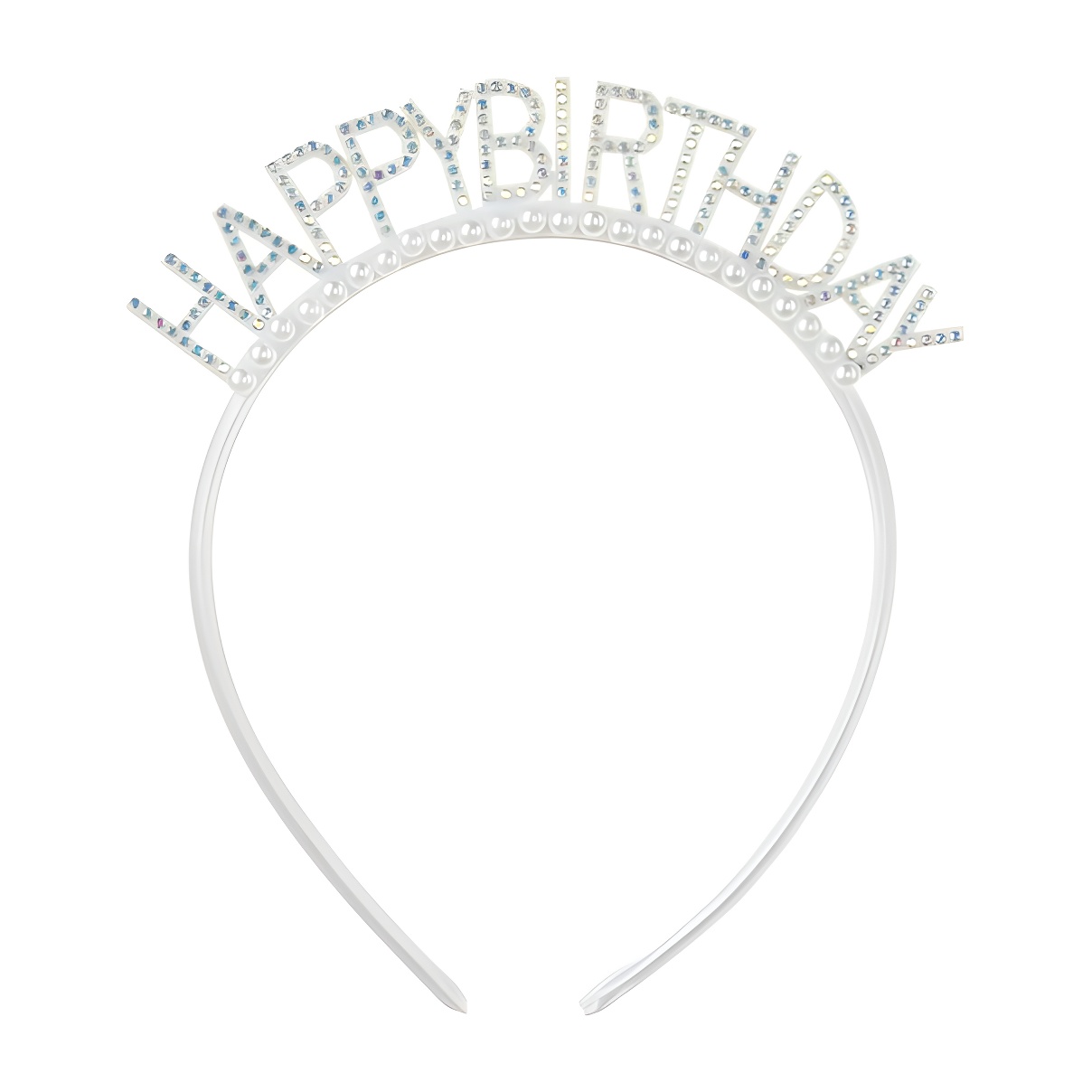 Serre-tête festif avec l'inscription "Happy Birthday" en finition argentée, agrémenté de perles décoratives et de détails scintillants.