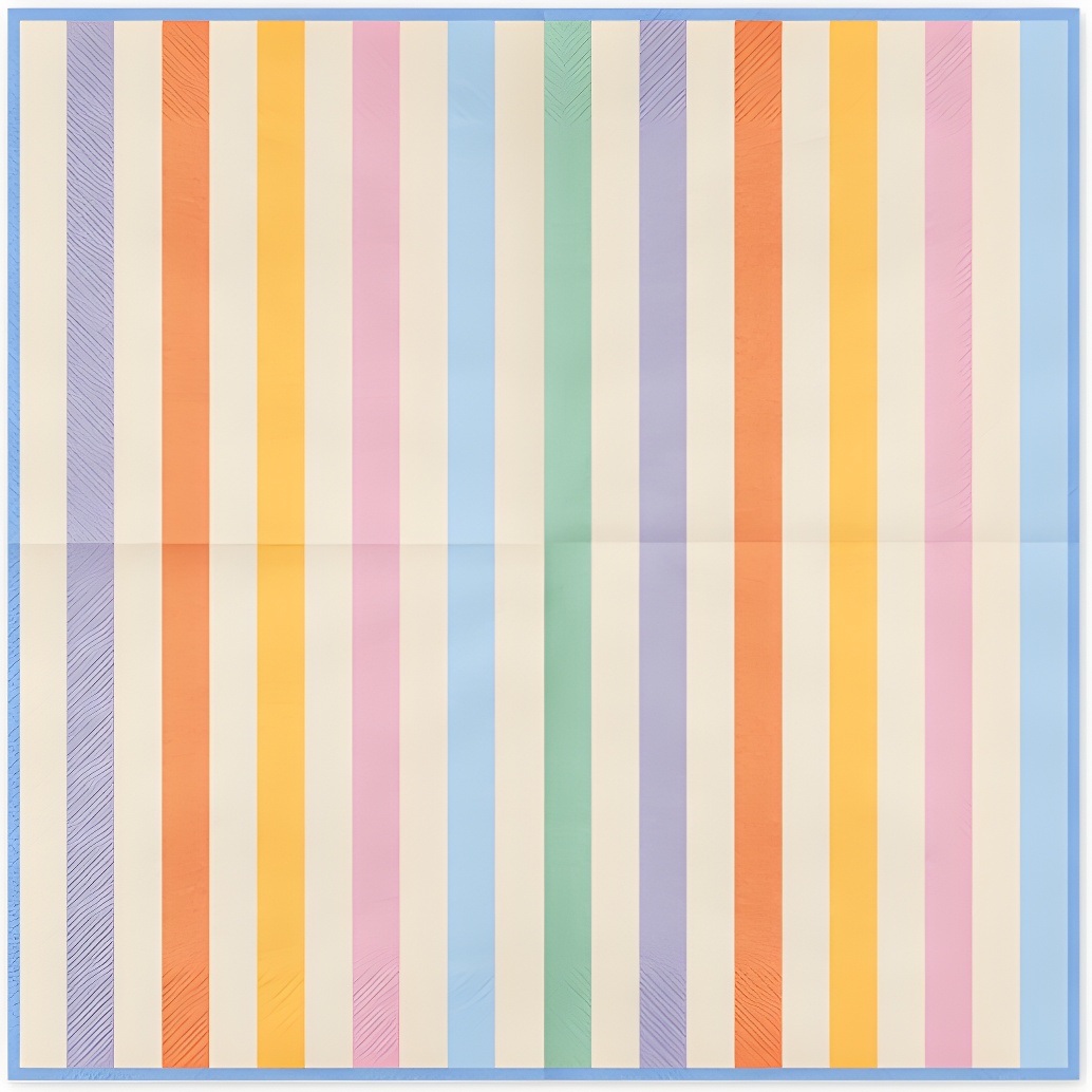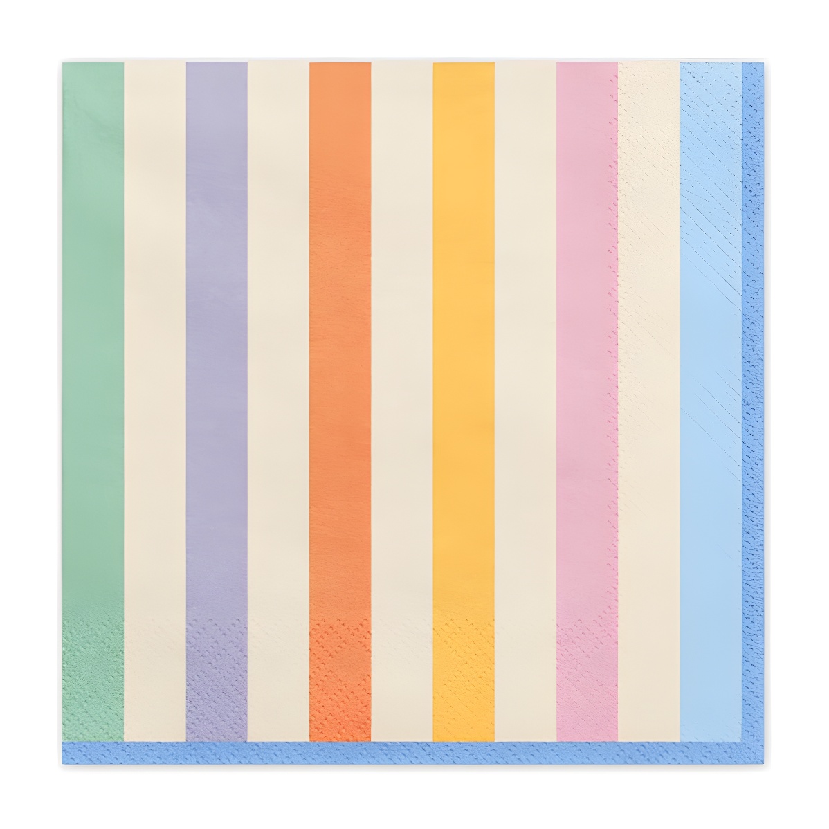 Serviettes en papier au motif rayé, aux couleurs pastel et vives, conçues pour compléter vos décorations enfantines avec style. Elles sont composées de 2 épaisseurs pour un toucher doux et une meilleure absorption. Dimensions: dépliées 33 x 33 cm ; pliées 16,5 x 16,5 cm. Présentées en paquet pratique, idéales pour dresser des tables à thème.
